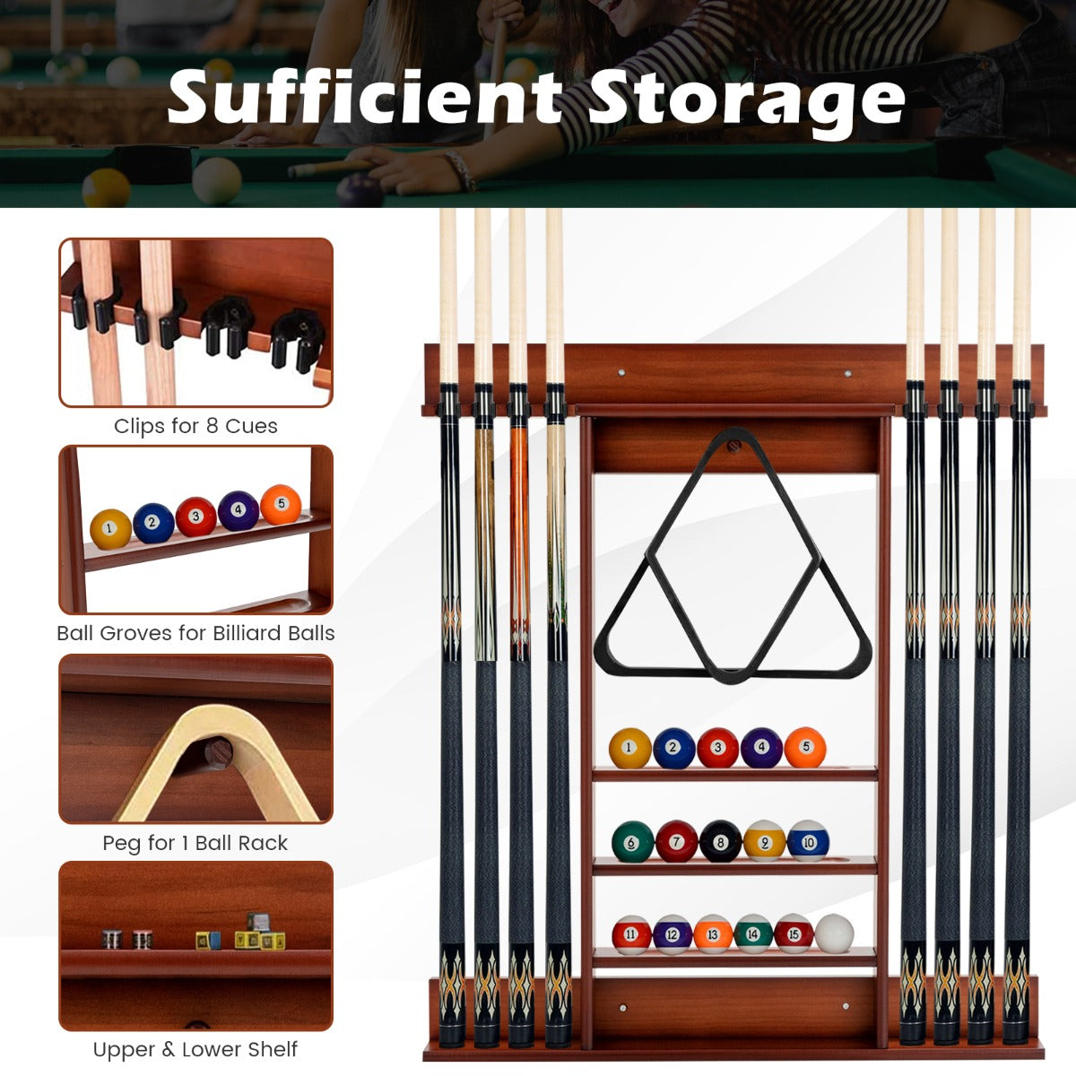 Includes clips for 8 cues, 3-tier ball groves for 15 billiard balls, peg for 1 ball rack and upper & lower shelves for brushes or chalks