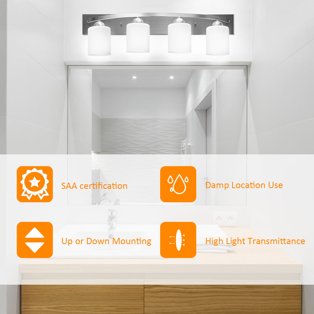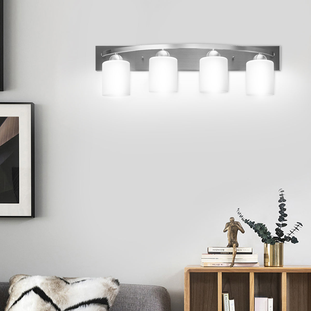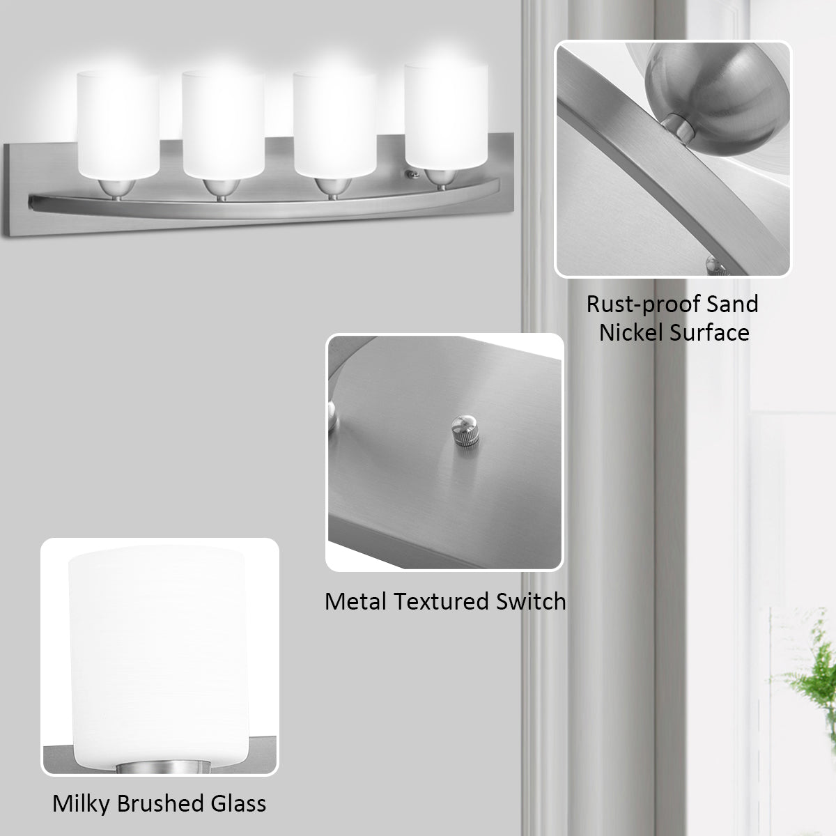 Elegant & Beautiful Design: With an elegant look, our wall mounted vanity lightinglight is a perfect lighting solution for your rooms. The modern 4-light vanity fixture, which brightens any room with its classic contemporary design that features a frosted glass cylinder gracefully nestles into a brushed nickel housing.