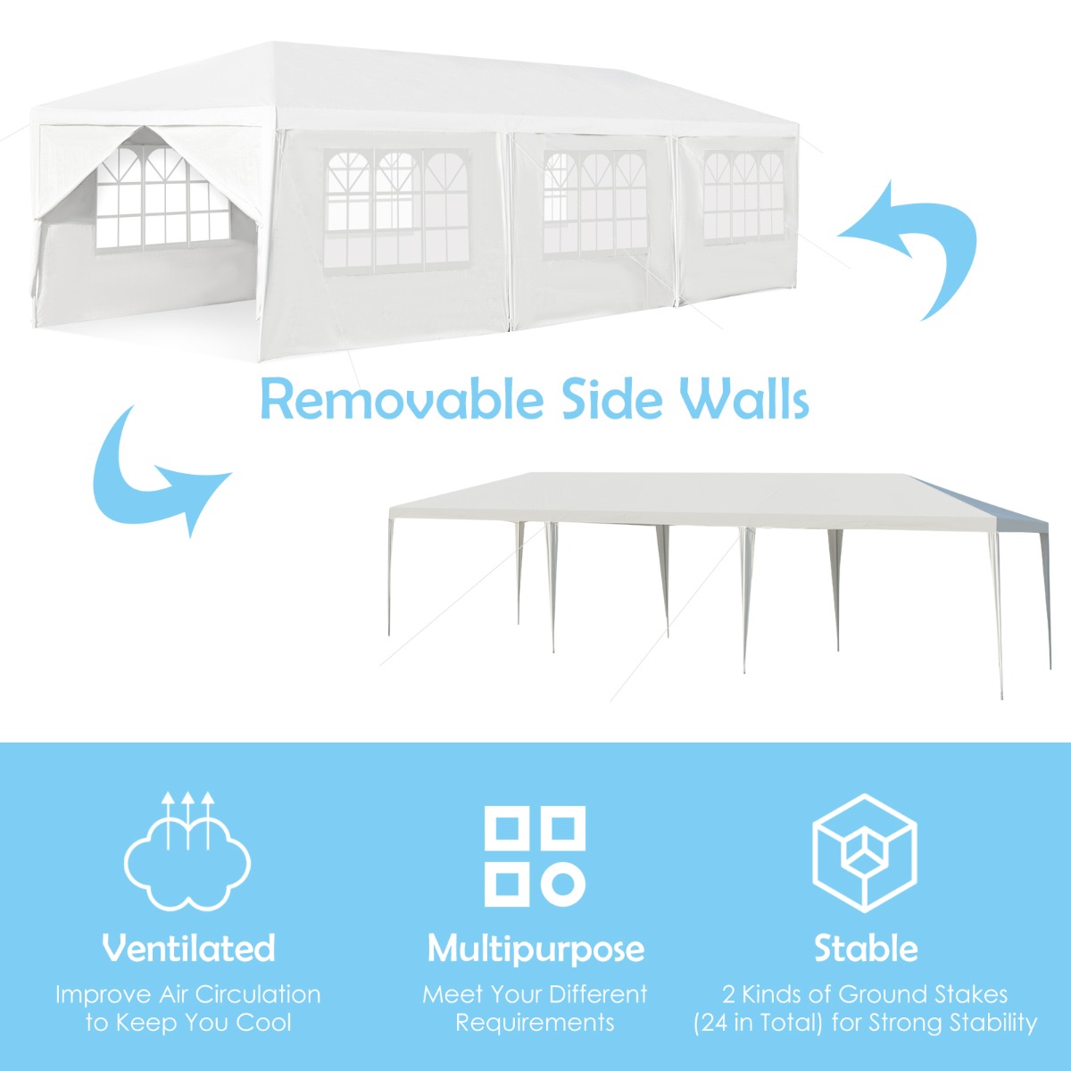 Multifunctional Gazebo: The tent is perfect for all outdoor activity such as party, picnics, camping, BBQ, flea market, outdoor sporting events, wedding and so on. And the gazebo can also be a temporary garage for your car, tools and patio furniture.