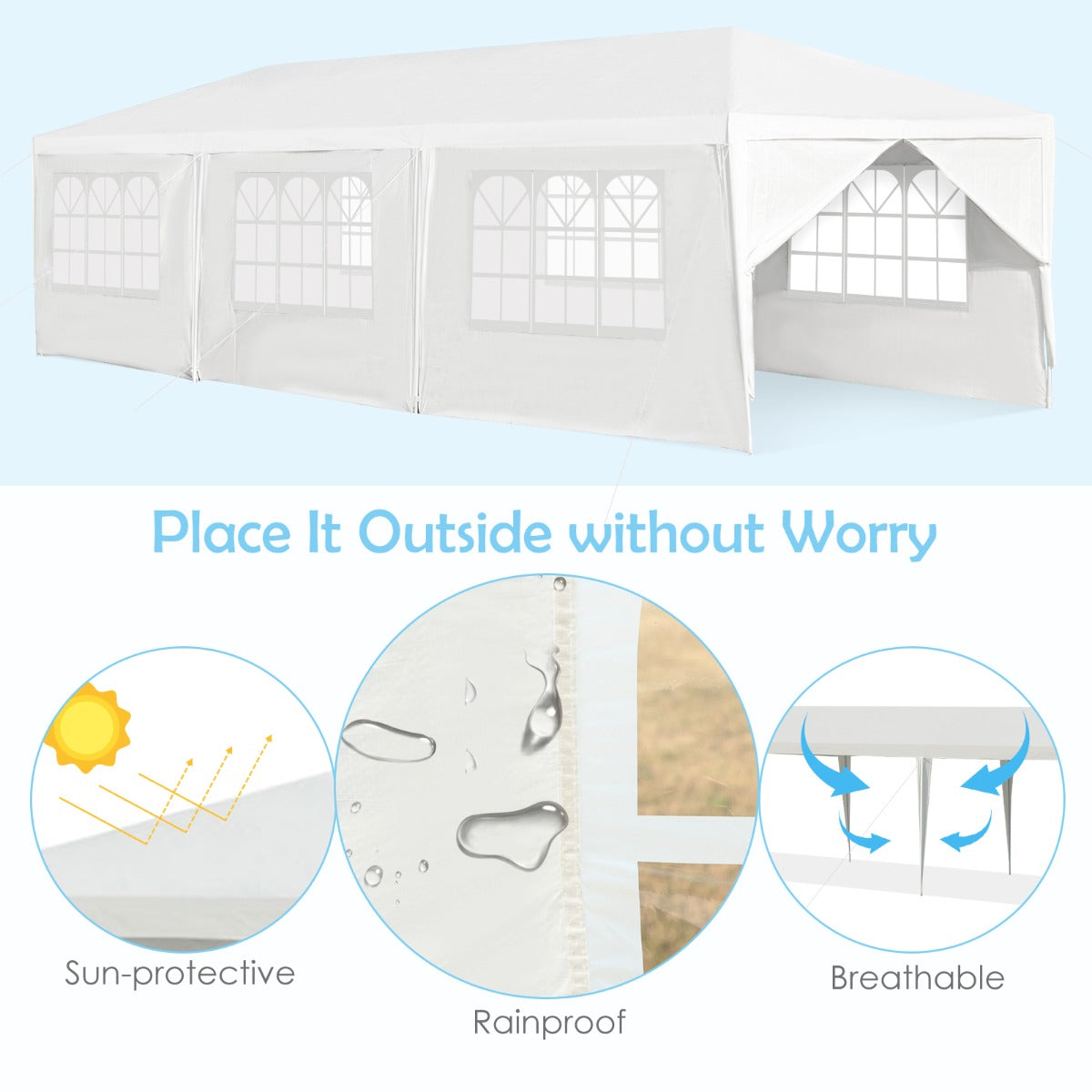 Large Inner Space: Our 3m x 9m outdoor tent has spacious inner space for you and your friends to have activities. You won’t feel crowded even if a lot of people stay in the gazebo together. Regardless of rain or sunshine, it will probably not affect outdoor activities.