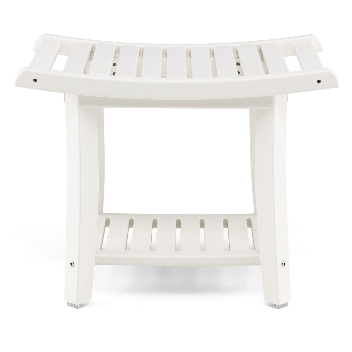 This waterproof and non-slip shower bench is a perfect addition to your bathroom! Made of high quality HDPE material with firm connection, this shower stool ensures good moisture resistance, mold resistance and high deformation resistance, which can serve you for a long time. The curved legs make the shower bench more stable and the bottom anti-slip foot pads prevent it from slipping away for high safety. Besides, the curved seat with round corners and burr-free edges make the shower bench safer to use. This 2-tier bath spa stool with a shelf offers ample storage space for bath products or any other items. It is perfect to be used beside the pool, sauna, hot tub or in the shower room, entryway, bedroom, living room, etc.