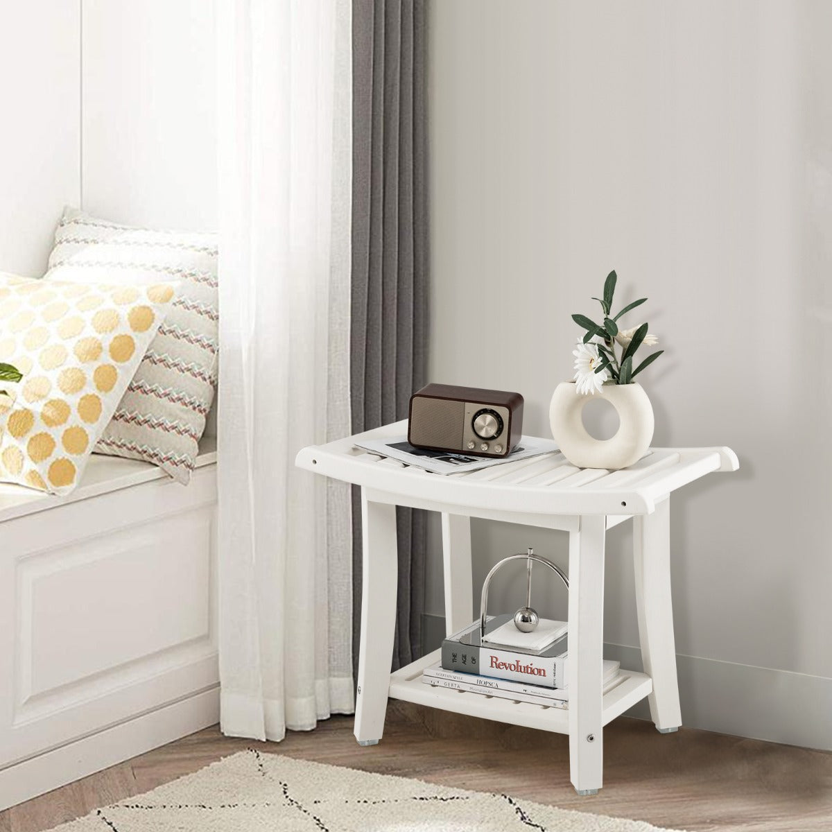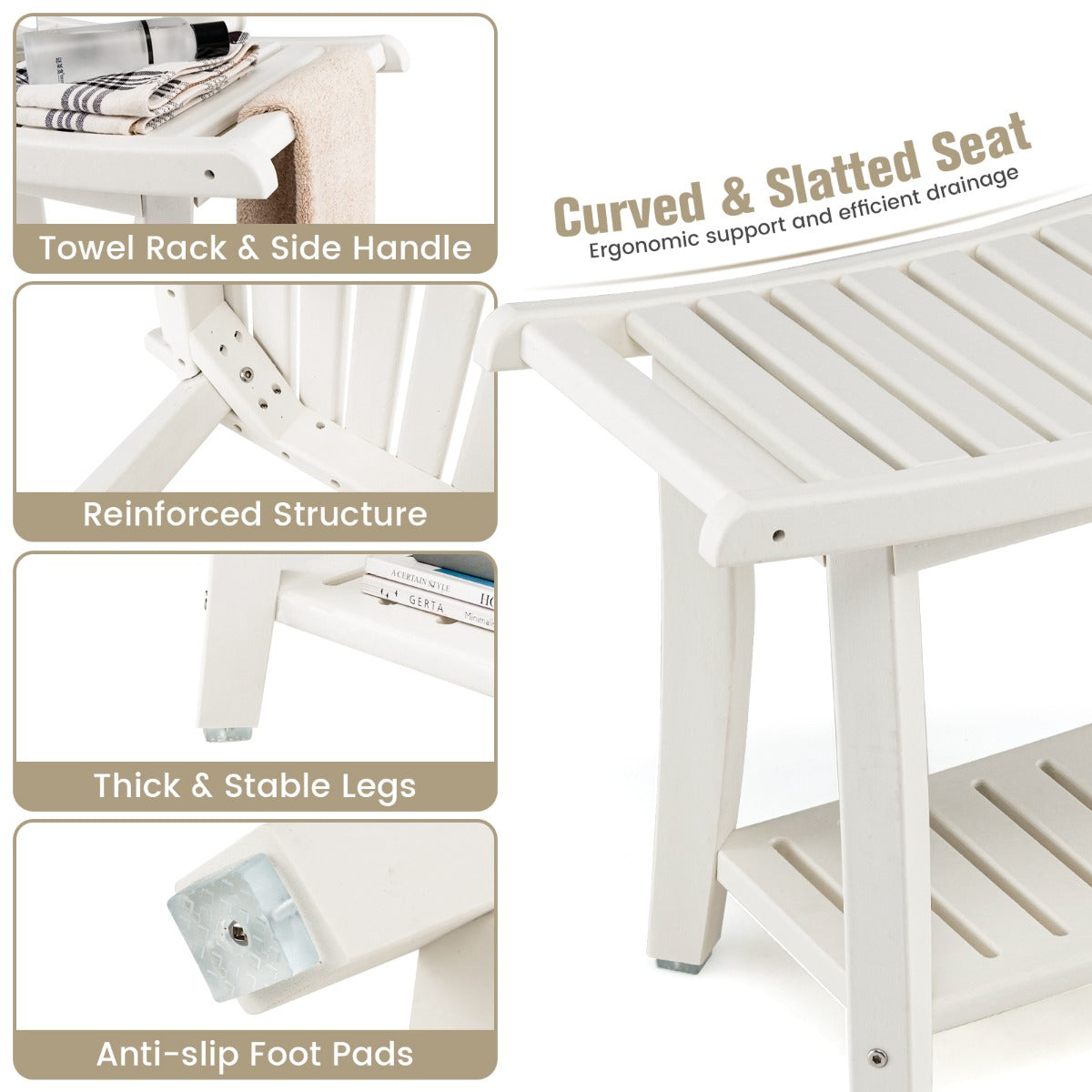 - Tier Large Storage Space:This 2-tier shower bench with a bottom open shelf provides roomy space to hold various items, such as toilet soaps, bath towels, body wash, candles, decorations, magazines and so on. Moreover, the side handles can also be used as towel racks to hang wet towels.