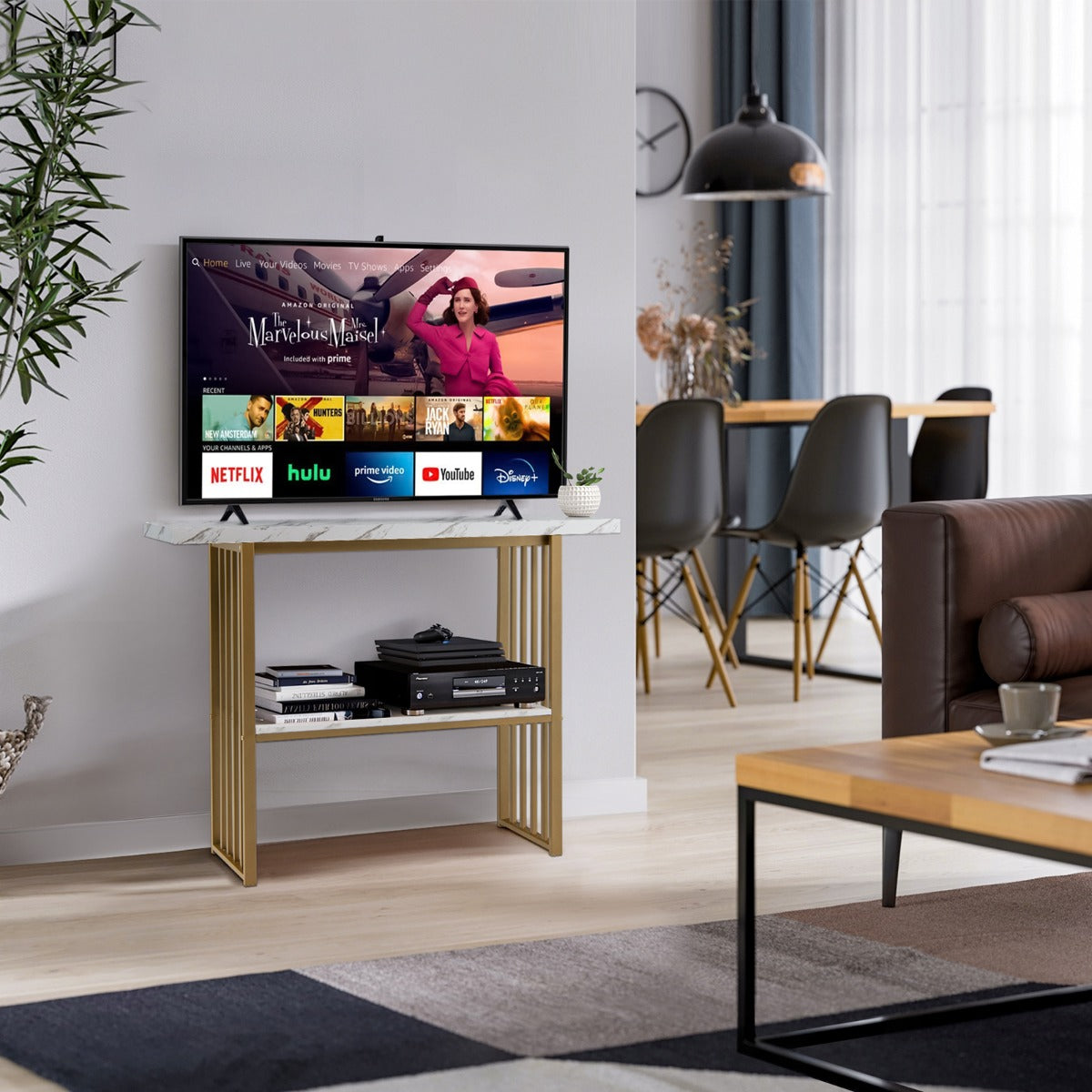 Our 2-tier console table can well suit your storage needs and will be a perfect piece in your home! It combines storage, decoration and display all into one. Wide tabletop and bottom shelf provide you with multiple storage options for assorting wide arrange of daily items. Thanks to the durable MDF and powder-coated steel frame, this entryway table is stable and strong enough for long-term use. More, the anti-toppling device also make an upgraded in stability. Our stylish faux marble console table is compatible with different home styles and interior decoration, which works great as an entryway table, foyer table, or buffet table, etc.