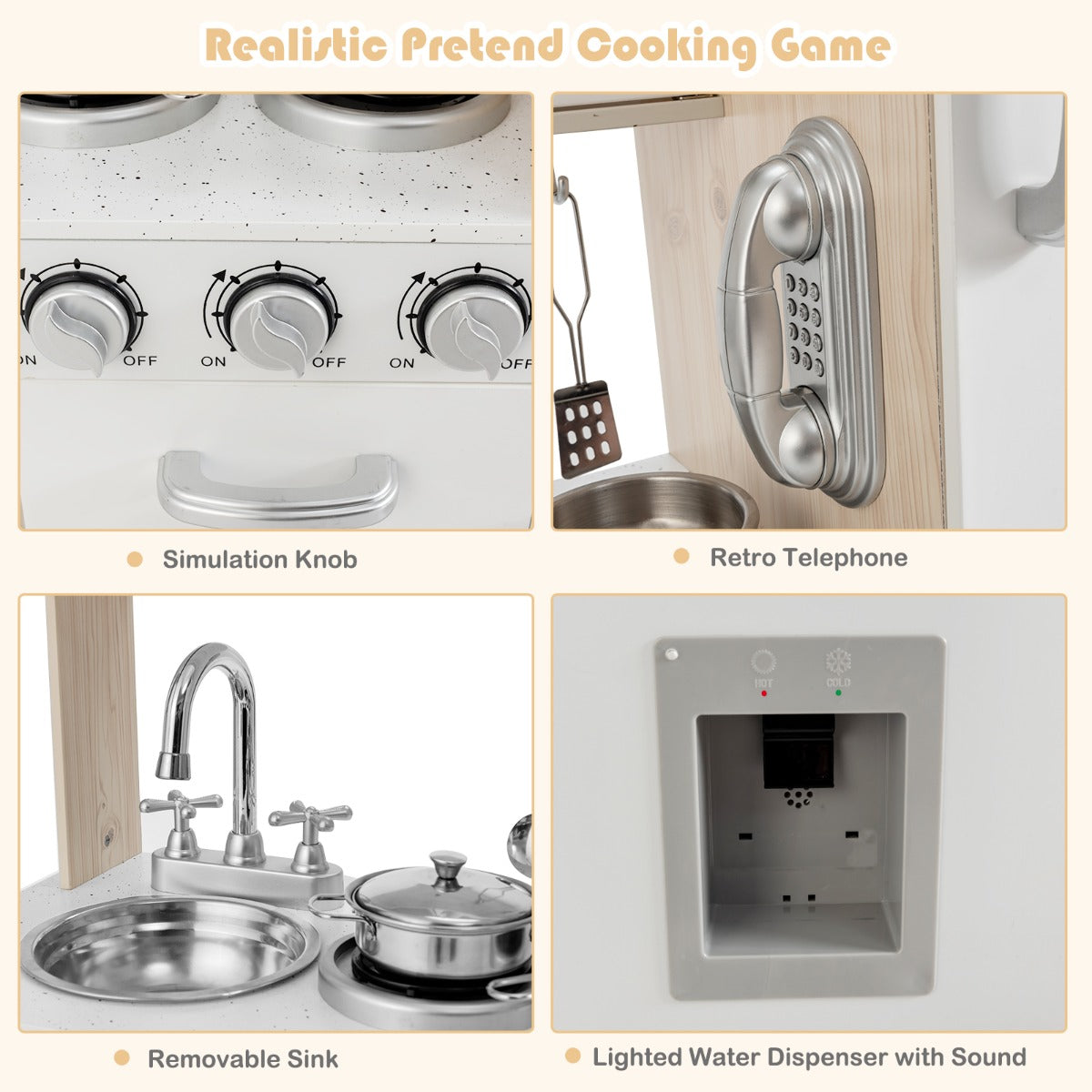 Highly Realistic Appearance: The realistic kids play kitchen will provide your little one with an authentic cooking experience, which features stove, sink, fridge, clock and knobs with sound. The water dispenser is designed with light and sound effects, which realistically simulate pouring water. Additionally, this kitchen toy set can avoid the dangers of real kitchens.