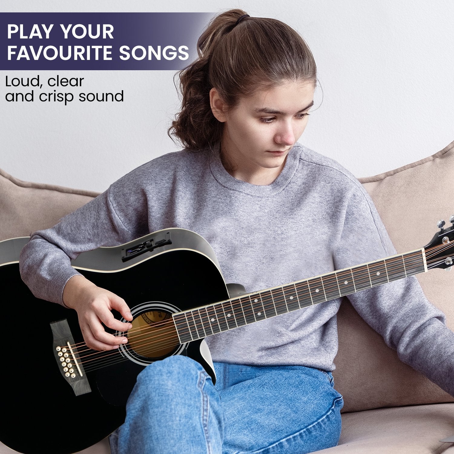 This beautiful guitar also comes with a carrying bag, strap, pick and capo so you'll have everything you need to play right away.