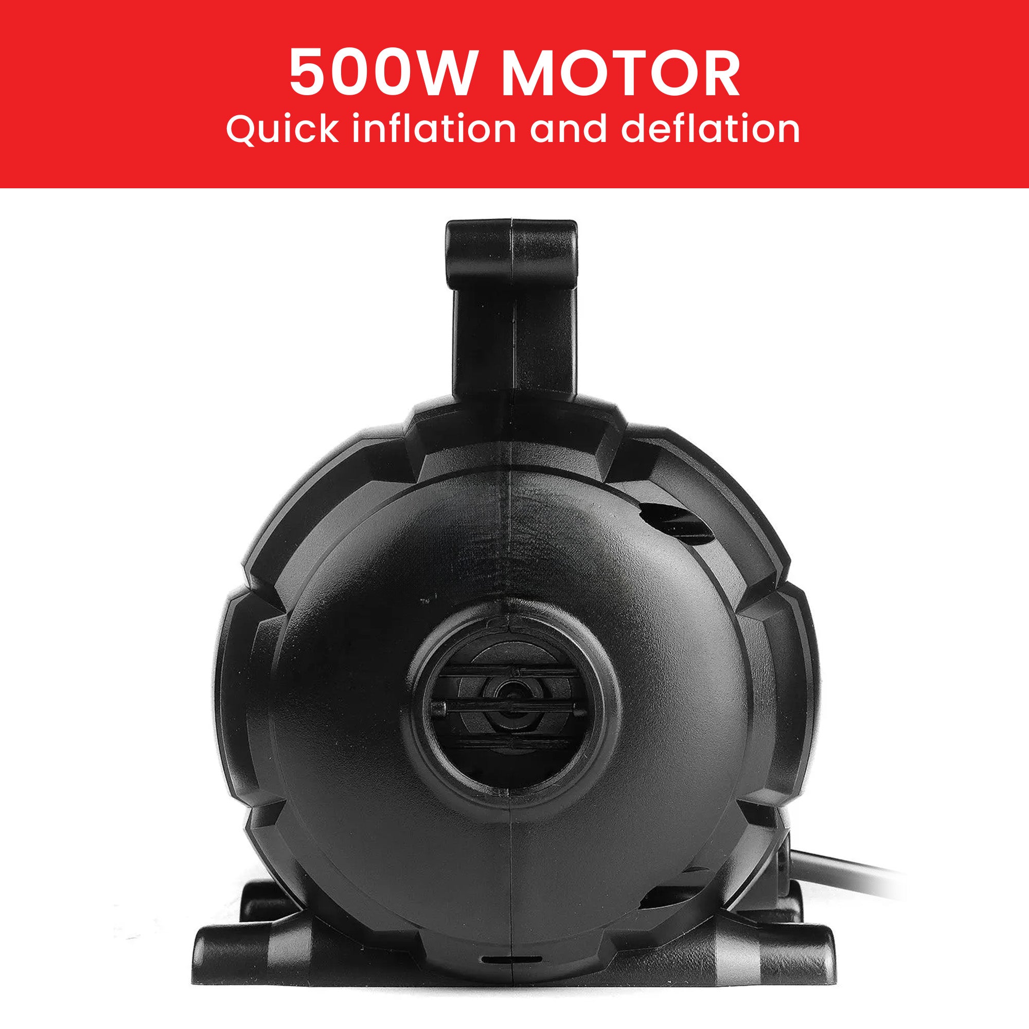 Engineered for swift inflation of air beds, air tracks and other inflatable items, the Powertrain air pump features a powerful 500W motor and operates on AC power. It includes three different nozzles for the hose for versatile use. The compact and lightweight design makes it easily portable for use anywhere.