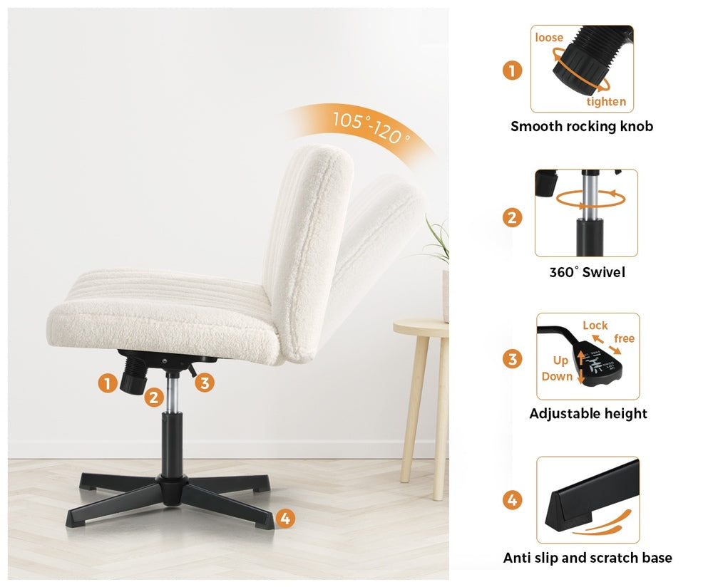 Crafted with a unique cross-leg base, this chair stands out as a symbol of modernity and stability. Its sleek Sherpa white fabric seat adds a touch of luxury to your workspace, ensuring both visual appeal and comfort. Our chair features a dynamic rocking backrest that allows you to gently sway and recline while you work. This soothing motion promotes relaxation and helps reduce stress during long hours at your desk. It is a game-changer for those who appreciate a little movement while they work.