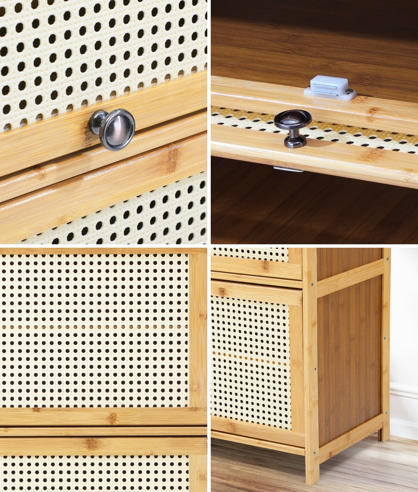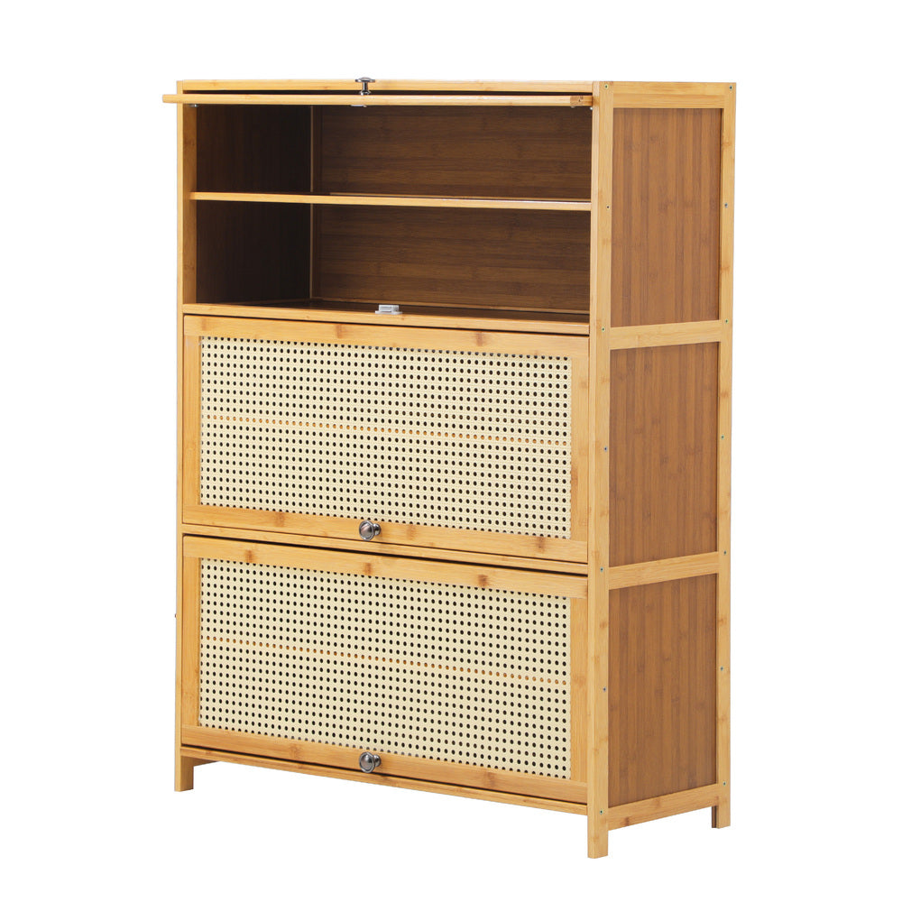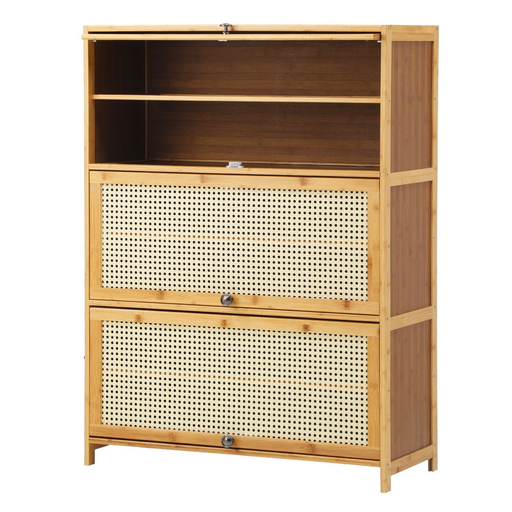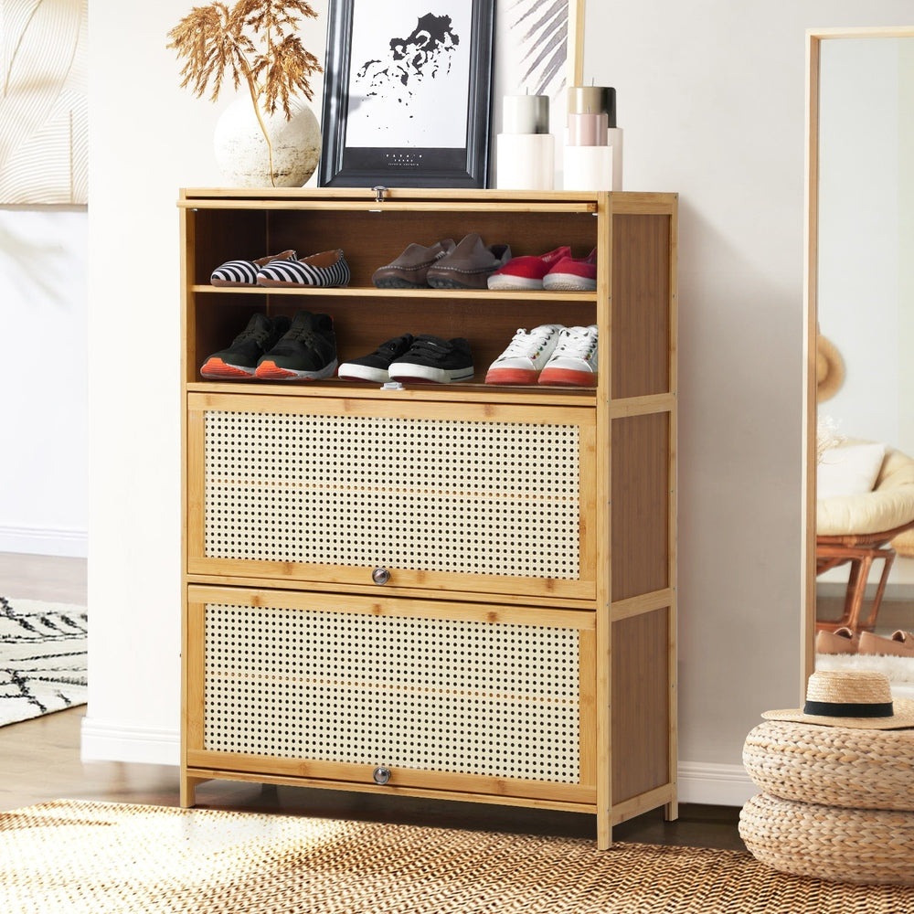 Introducing our innovative Shoe Storage Cabinet by Oikiture, where modern design meets practical functionality. This cabinet features three compartments with rattan doors, each thoughtfully arranged from top to bottom, offering optimal organization for your footwear. With two shelves in each compartment, you can neatly store and showcase your favorite pairs.