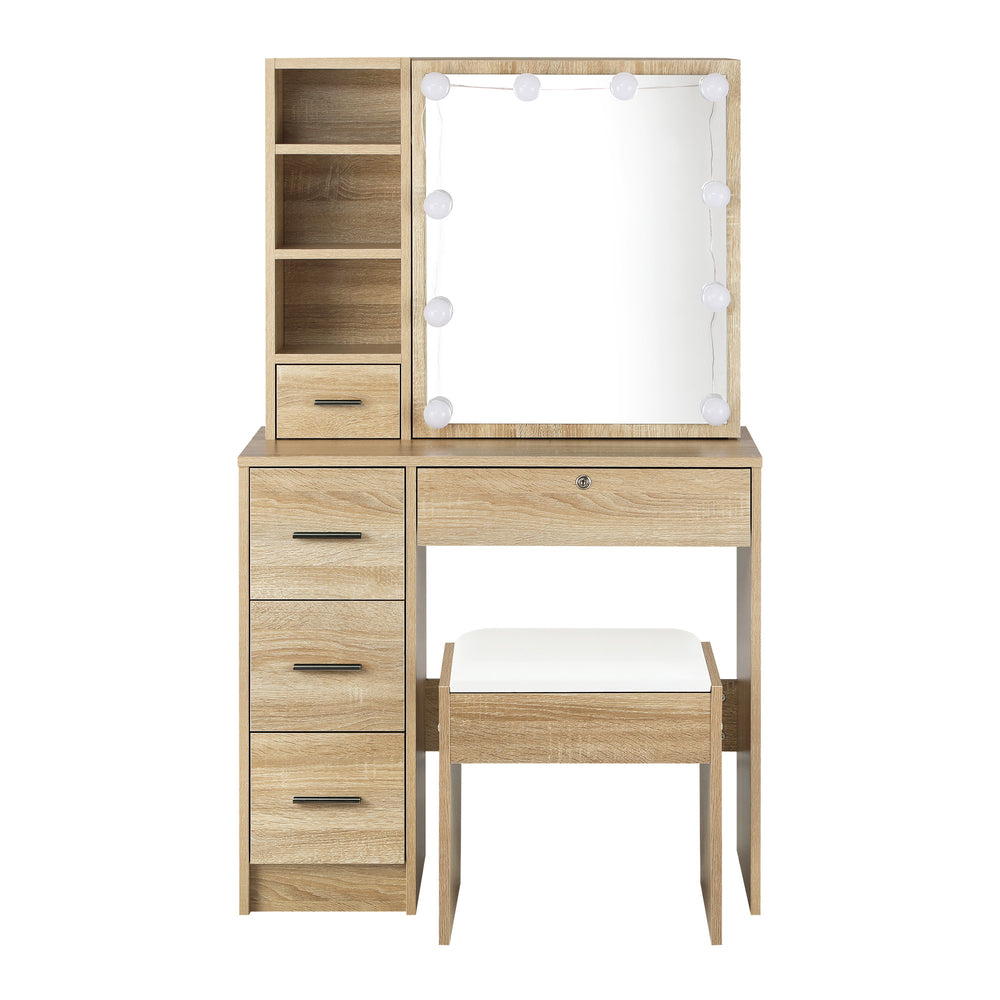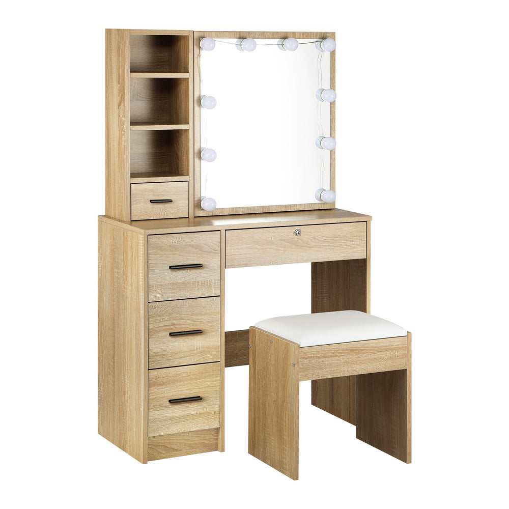 NNEED Dressing Table Stool Set with 10 Bulbs Mirror Wooden