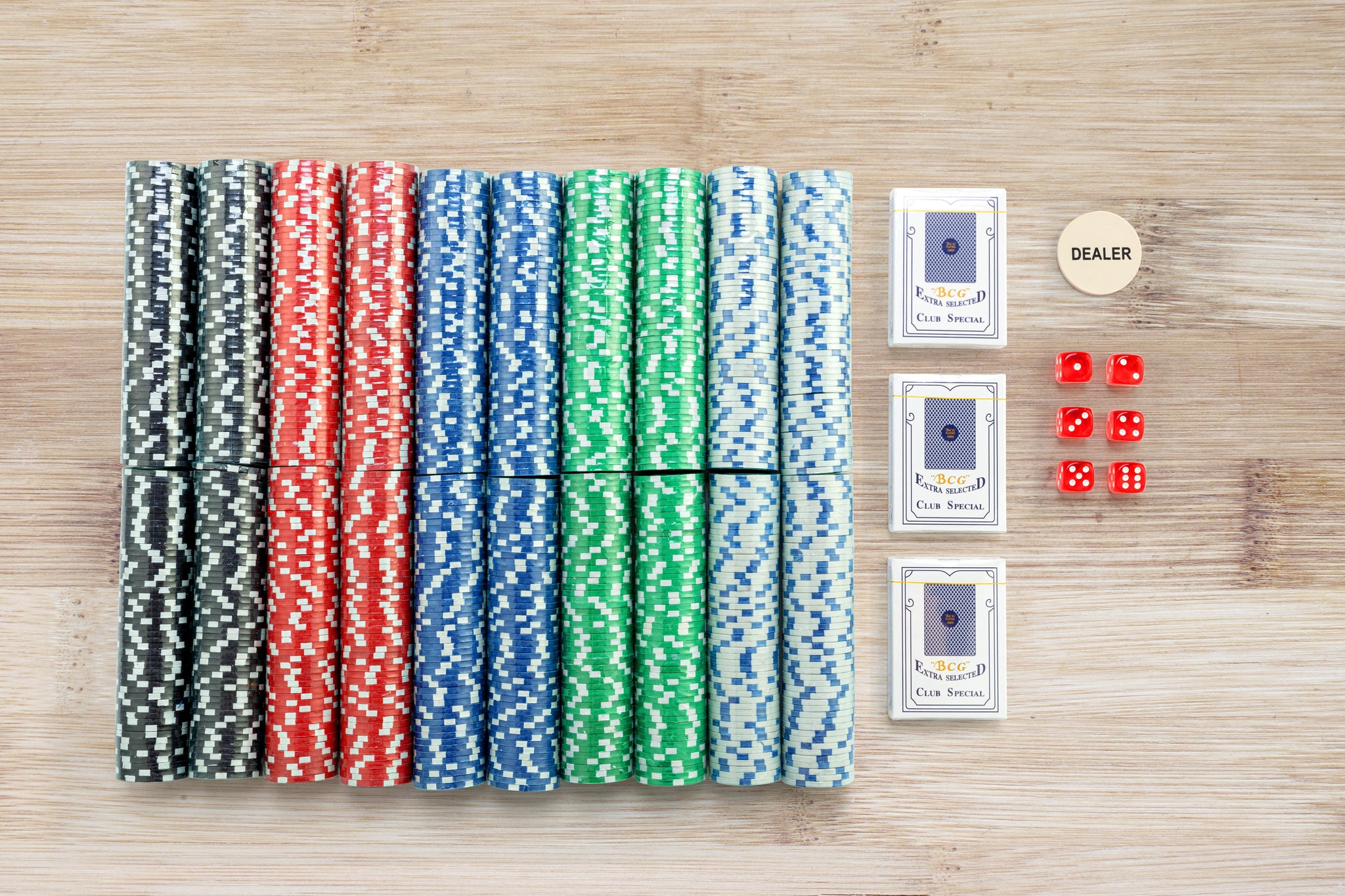With 1000 weighted, casino-quality poker chips, three full decks of paper cards, and a dealer and two blinds buttons, and six heavy dice, this 1000 chip poker set includes everything needed to create the full casino experience at home.