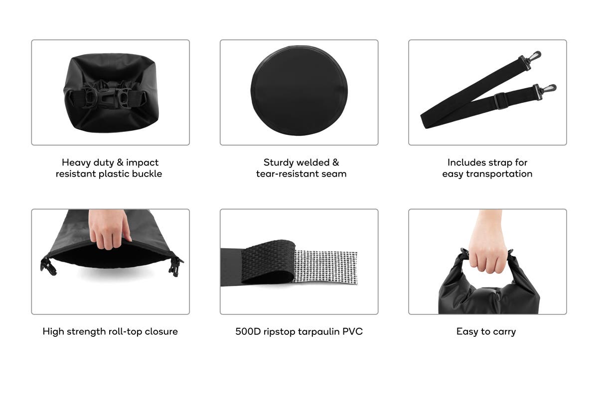 This dry bag features a tear-resistant seam, a high strength roll top closure to keep your items safe, a ripstop tarpaulin material and impact resistant buckle – all to protect your valuables.