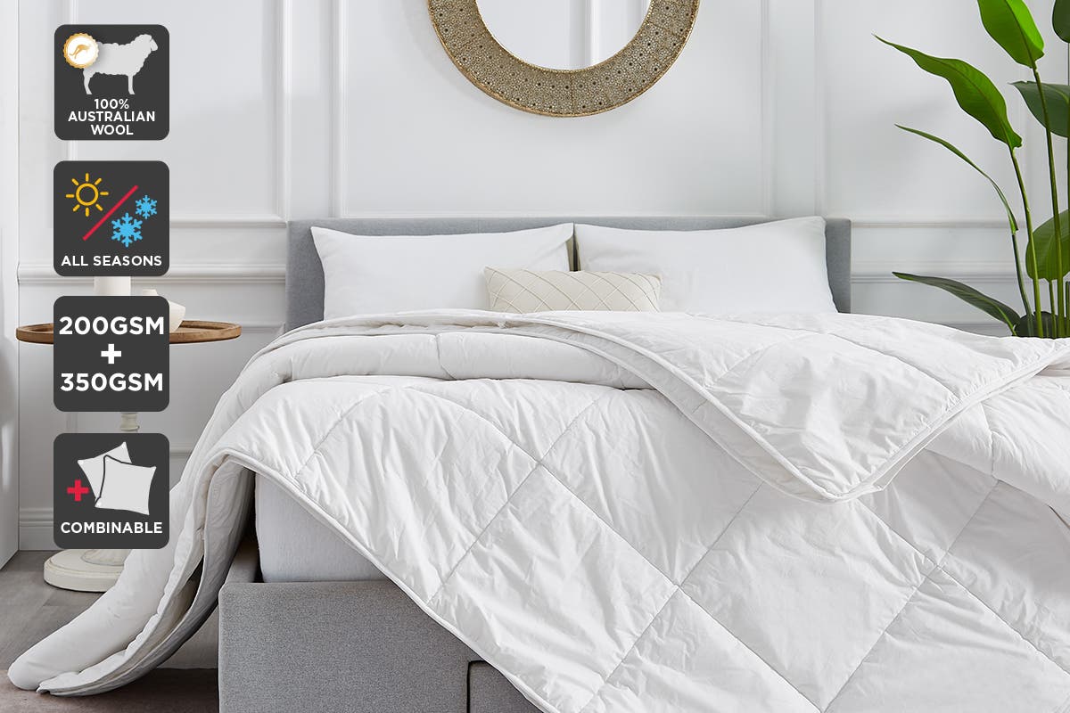 Enjoy the cosy comfort of the Trafalgar 3-in-1 All Seasons Wool Quilts that features beautiful natural textiles that are soft on sensitive skin, with a cotton cover and 100% Australian wool filling.