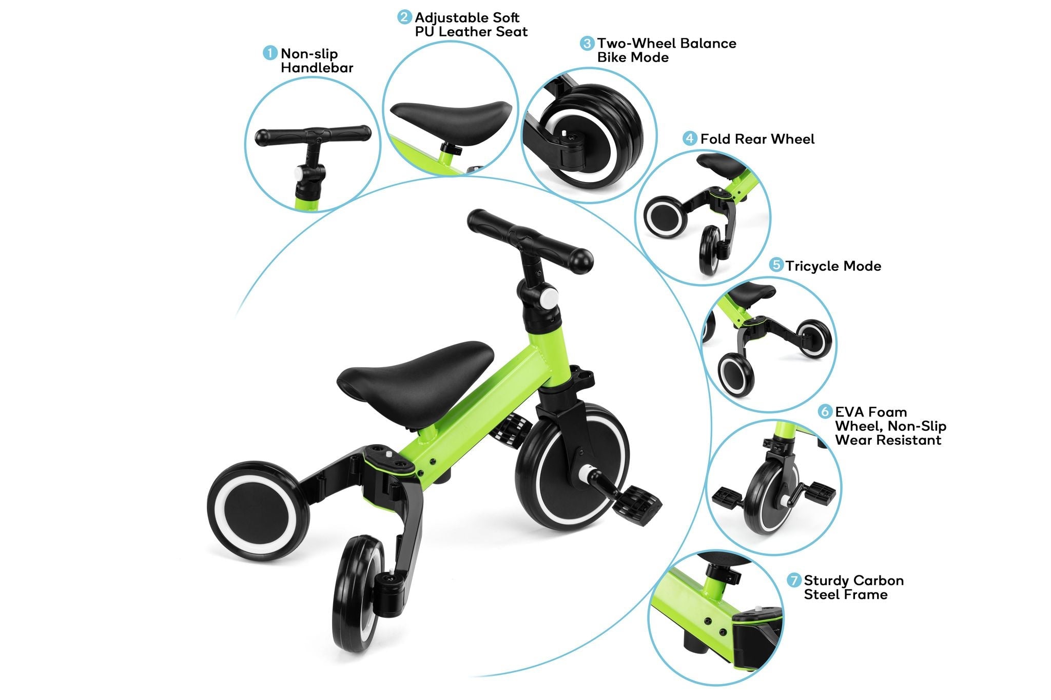 Kickstart your child’s journey to learning how to ride with the Essentials For You 3-in-1 Trike & Balance Bike (Green), converting from a three-wheeled bike to help your child improve their strength, mobility, and coordination skills.