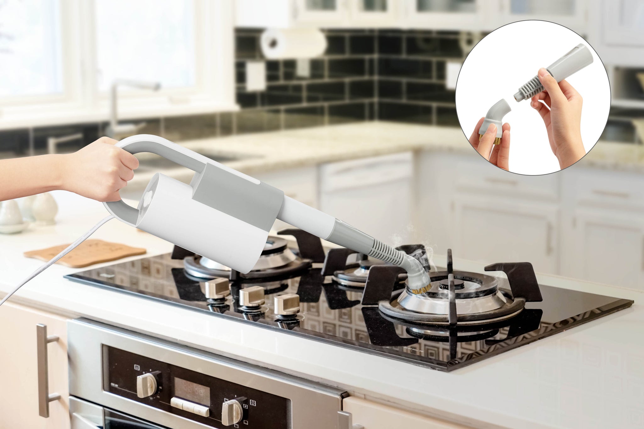 - Jet nozzle generates concentrated steam flow to easily lift grime from ovens, BBQs and microwaves