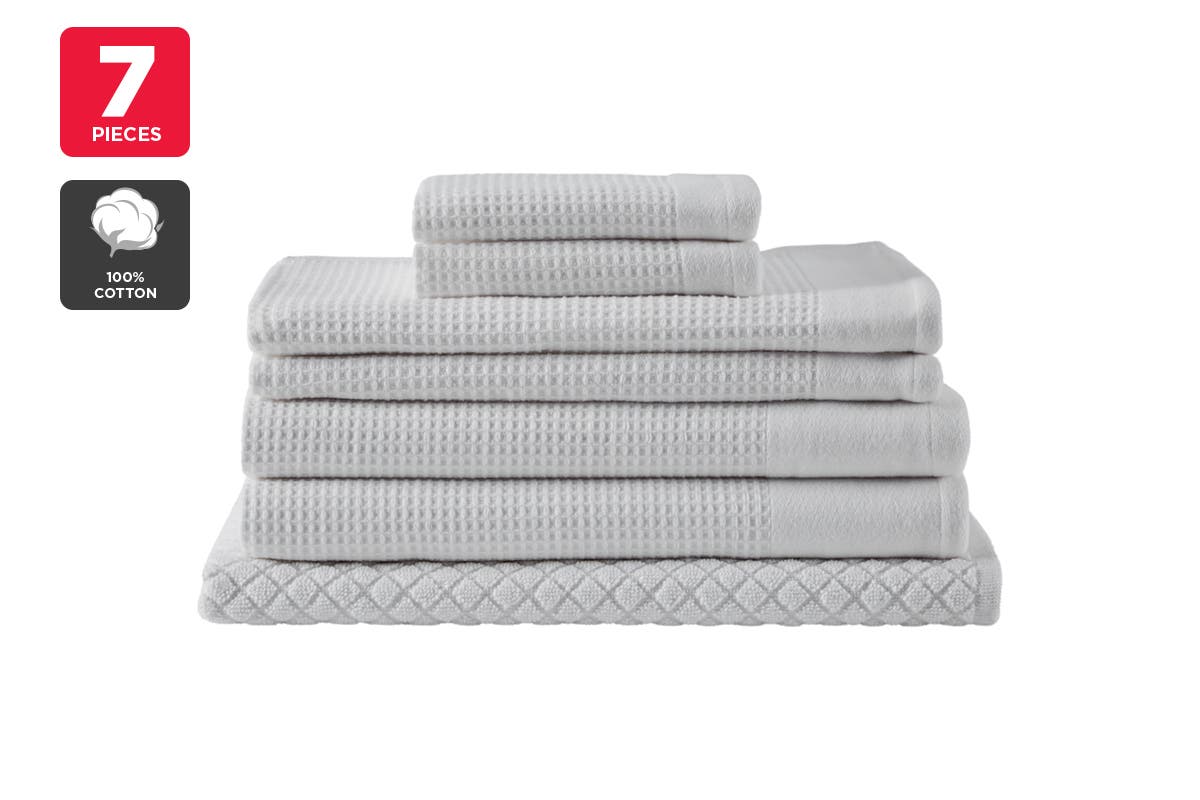 Add interesting textures to your bathroom with the Trafalgar Cotton Waffle 7PC Towel Set that will have you feeling fresh, dry and luxurious.