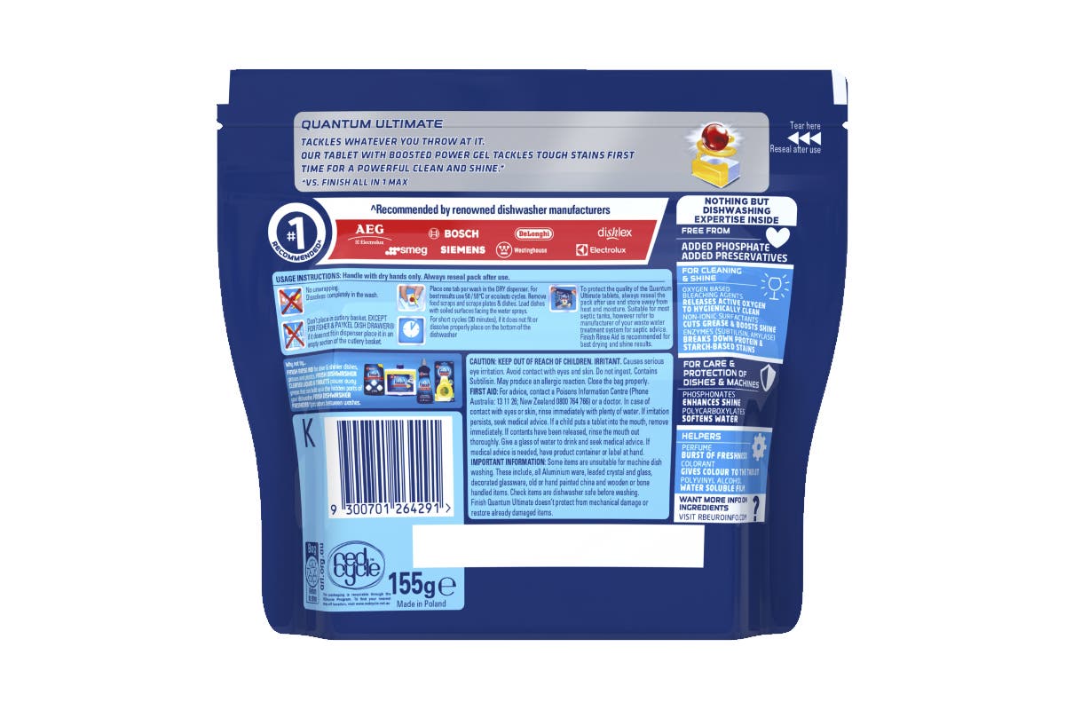 The Finish Quantum Ultimate Lemon Sparkle tablets actively clean dishes and boosts shine. These tablets tackles tough stains first time for a powerful clean and shine.