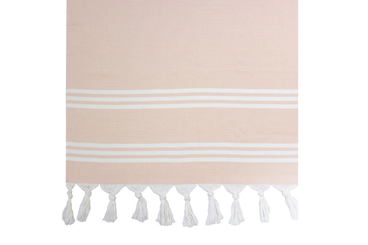 The Bambury Amalfi Beach Towel features classic stripes and knotted fringes, inspired by traditional Turkish Hammam towels.