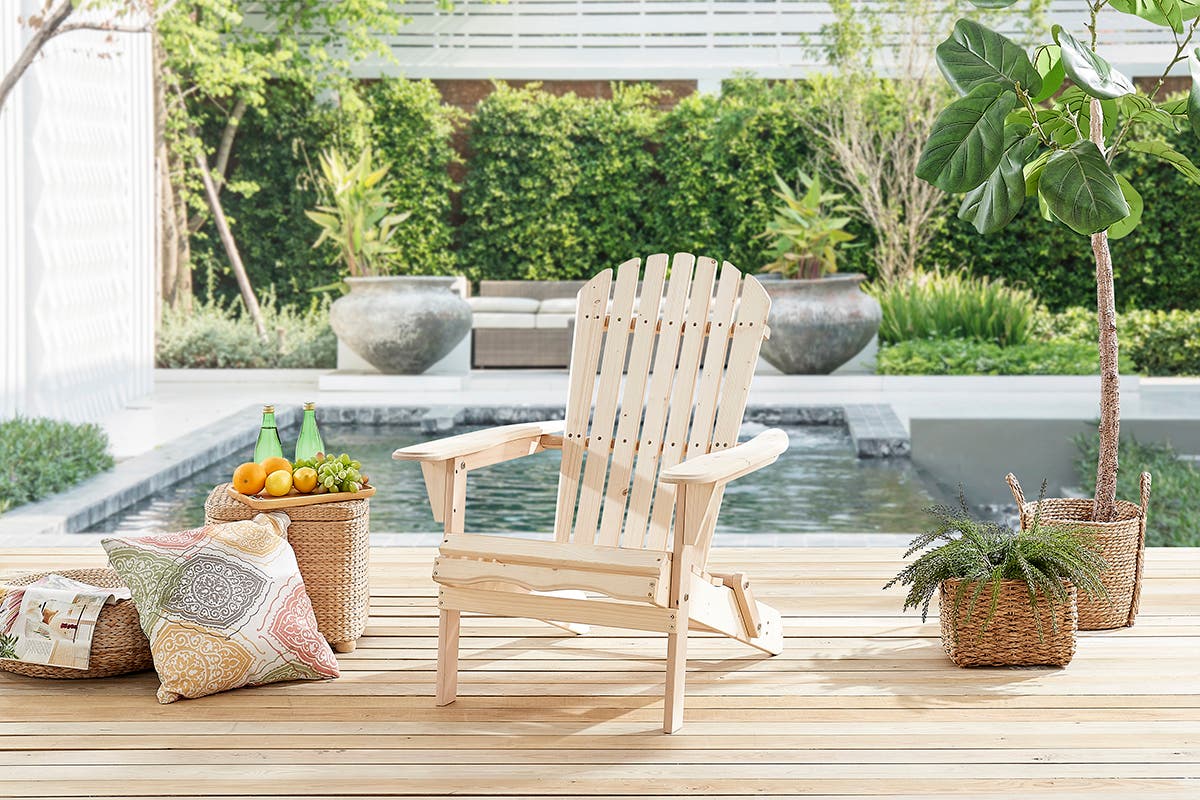 Bring the style and class of a Hamptons Beach House to your outdoor living space with a weather-resistant chair built from natural wooden slats.