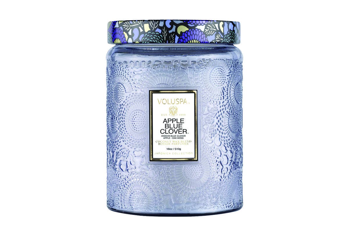 The Voluspa Apple Blue Clover Large Glass Jar Candle 100 Hour has notes of Andean blue clover, apple and oak moss. At sunrise, fresh clover springs from morning grass while violet emerges to meet it.