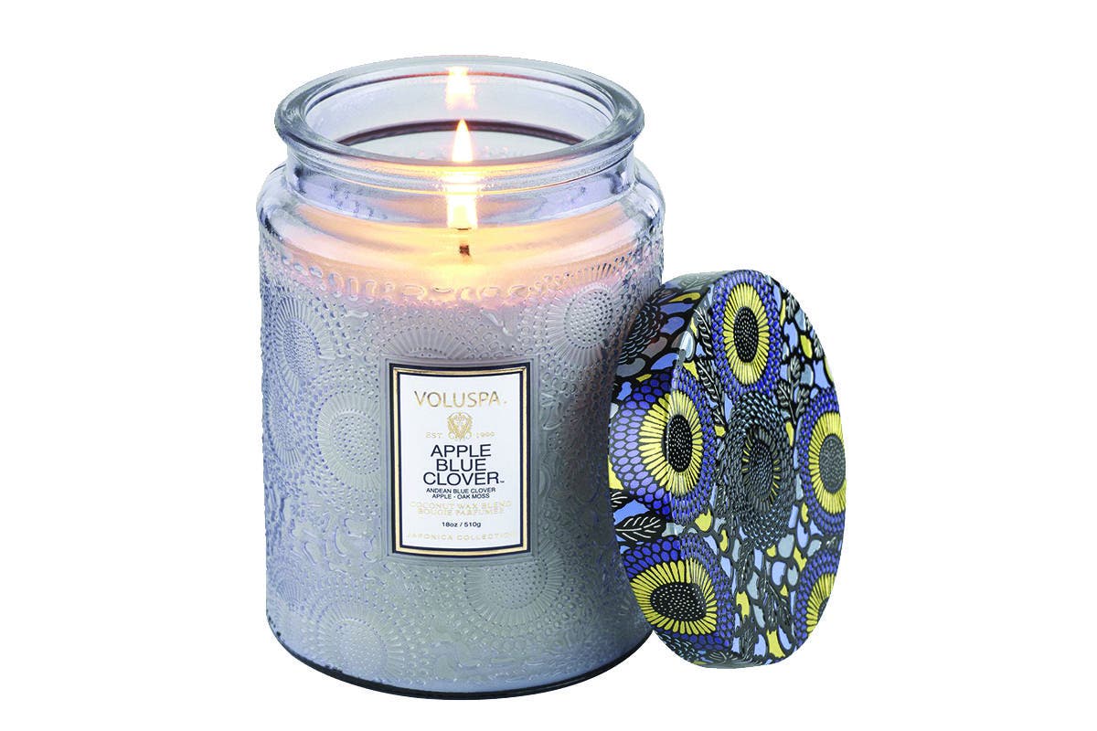 Collectively breathing and sighing with spring’s freshness, the Voluspa Apple Blue Clover Large Glass Jar Candle 100 Hour has roses, lily of the valley, cucumber, jasmine and melon blossom at once to create an extraordinary bouquet. Voluspa’s signature glass jar silhouette is embossed in the iconic japonica floral pattern, inspired by Japanese Chiyogami papermaking. A metallic decorative lid can be used to extinguish the flame or keep the candle dust-free when not in use. This format will transform the atmosphere for over 100 hours of burn time and makes a beautiful jar for keepsakes, flowers or decor long after the candle is gone.