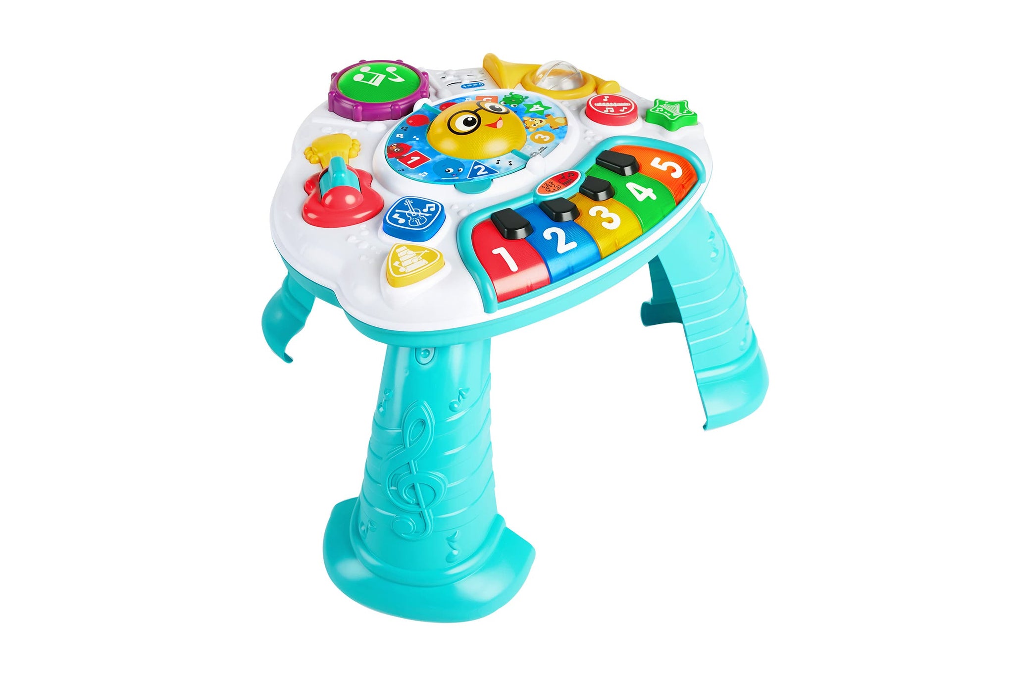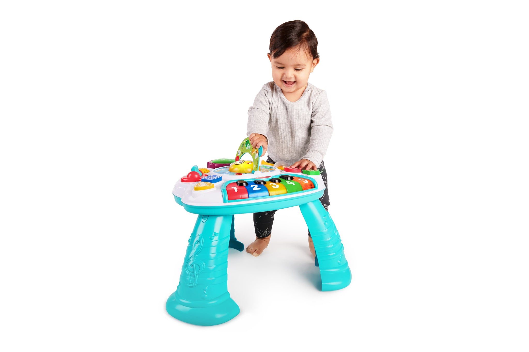 Introduce your child to a world of creativity with the Baby Einstein Discovering Music Activity Table Activity Center that helps them discover and make music. Babies can tap the piano keys to hear musical notes and with the switch of a button the piano keys will introduce colours and numbers. The strummable guitar, tappable drum and spinnable French horn ensure your little composer will have a blast exploring baby instruments. At the centre of the table, a music book is ready for your baby to flip the page and activate melodies, lights and discovery modes. The music development table grows with your baby – it’s great for floor play without the legs for younger babies or attach the legs for stand and play discovery.