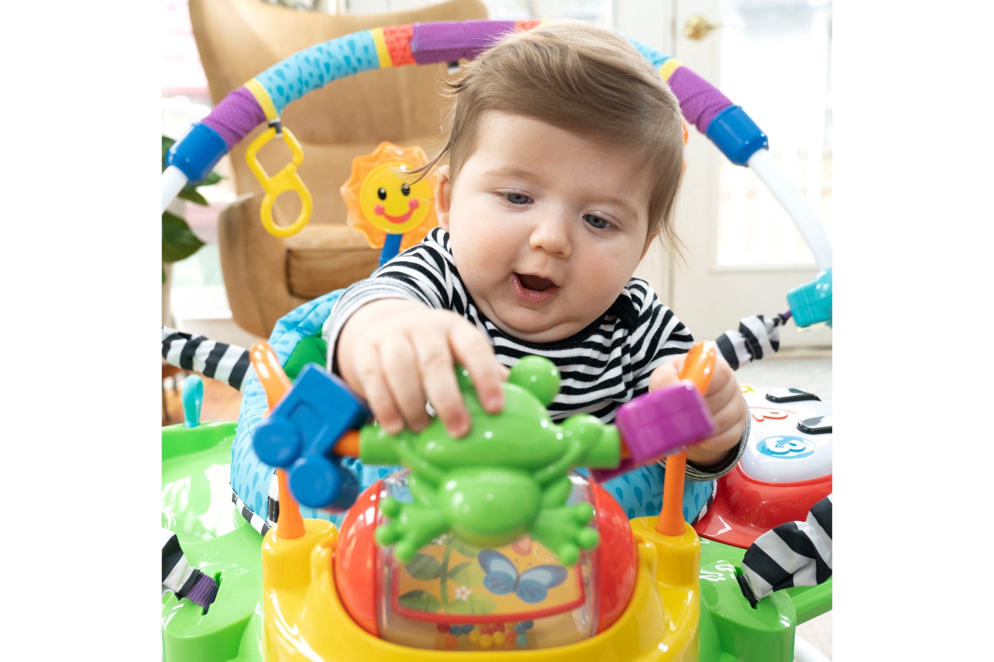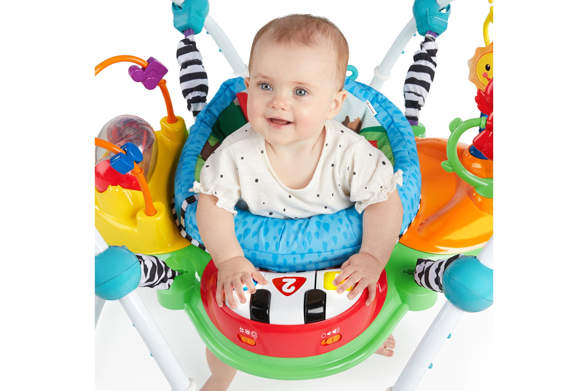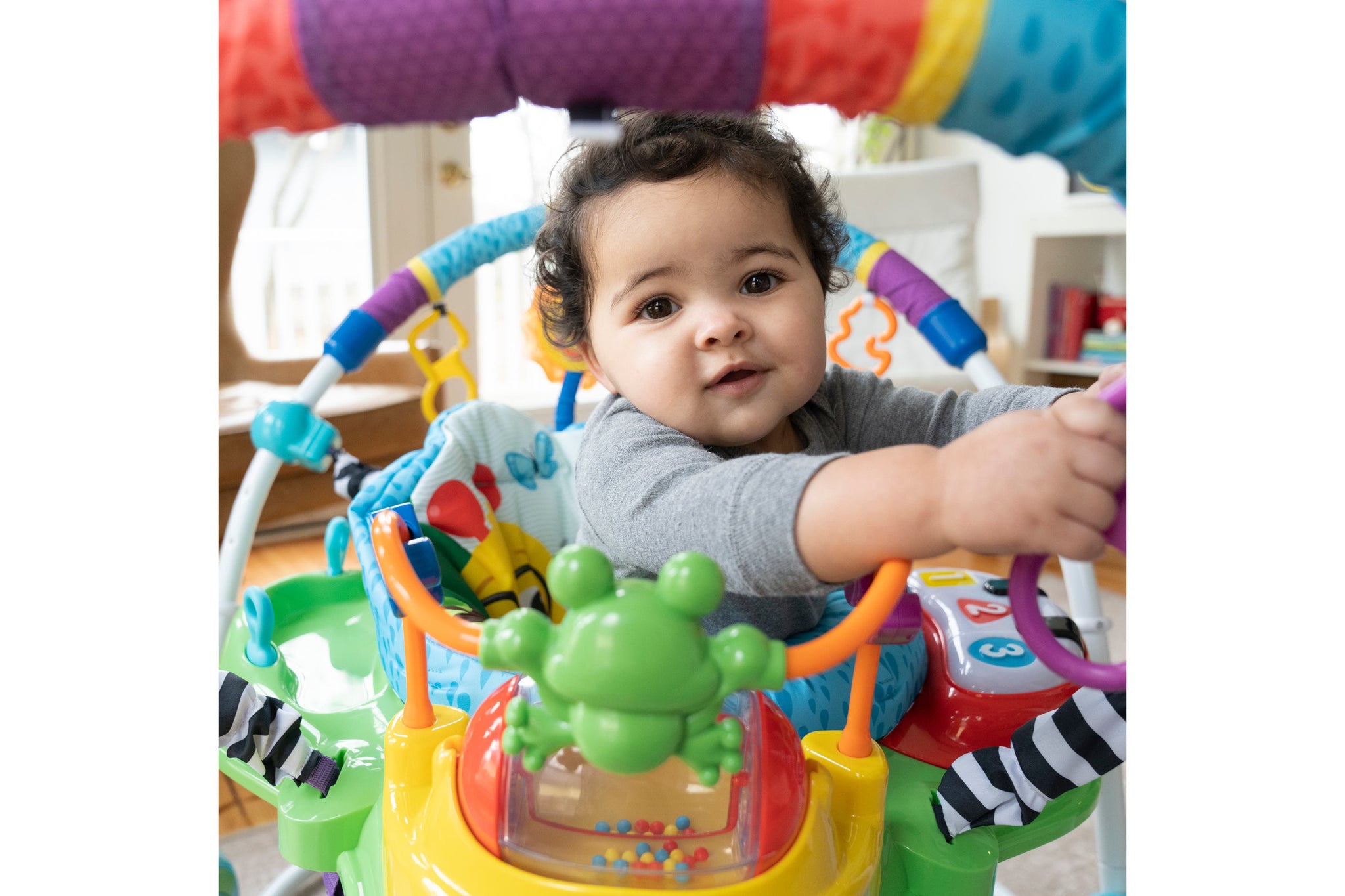 The Baby Einstein Neighbourhood Friends Activity Jumper features 3 play stations and more than 12 activities to explore. The light-up piano lets your baby compose their first musical masterpiece, while the spinning frog bead chaser encourages hand-eye coordination. With extra link loops, you can add your baby’s favourite toys or swap out new playful friends so entertainment is always in reach. The baby bounce chair allows your little one to jump and dance, which helps strengthen their developing leg muscles. With no doorways required, you can watch your baby safely play and grow wherever you need to be.