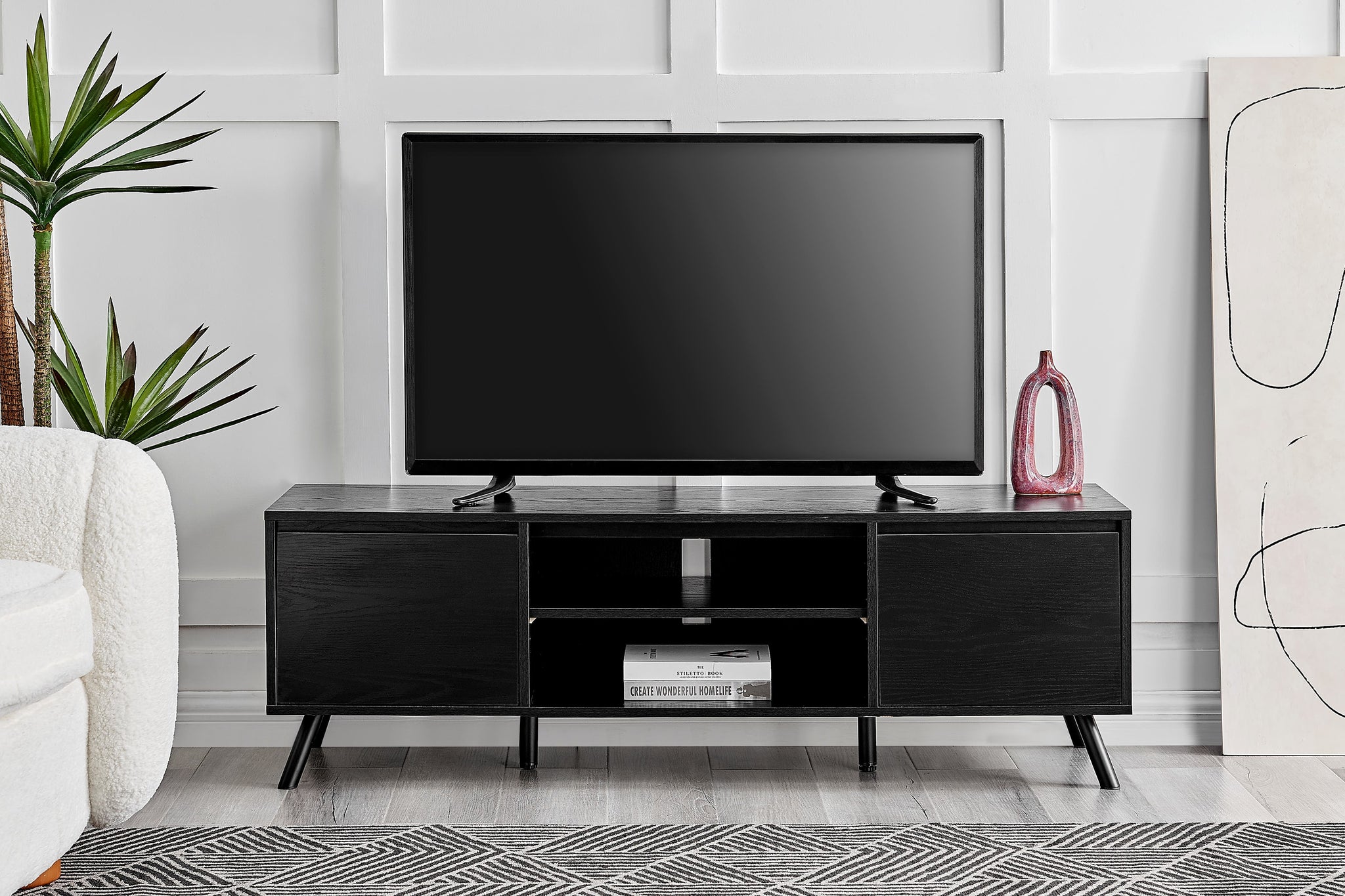 Made with clean angles, classy dark colour and a timber-look finish, this entertainment unit elevates the look of your lounge and provides an eye-catching statement piece for your TV.