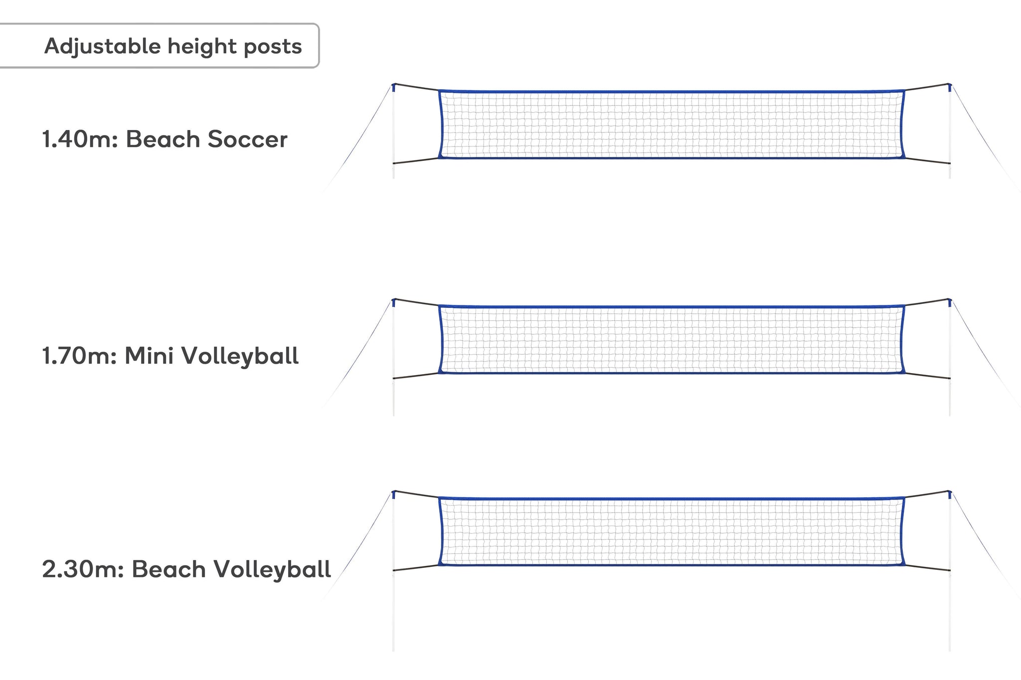 With two adjustable posts, you can change the height of the net to play beach volleyball, soccer or mini volleyball games.