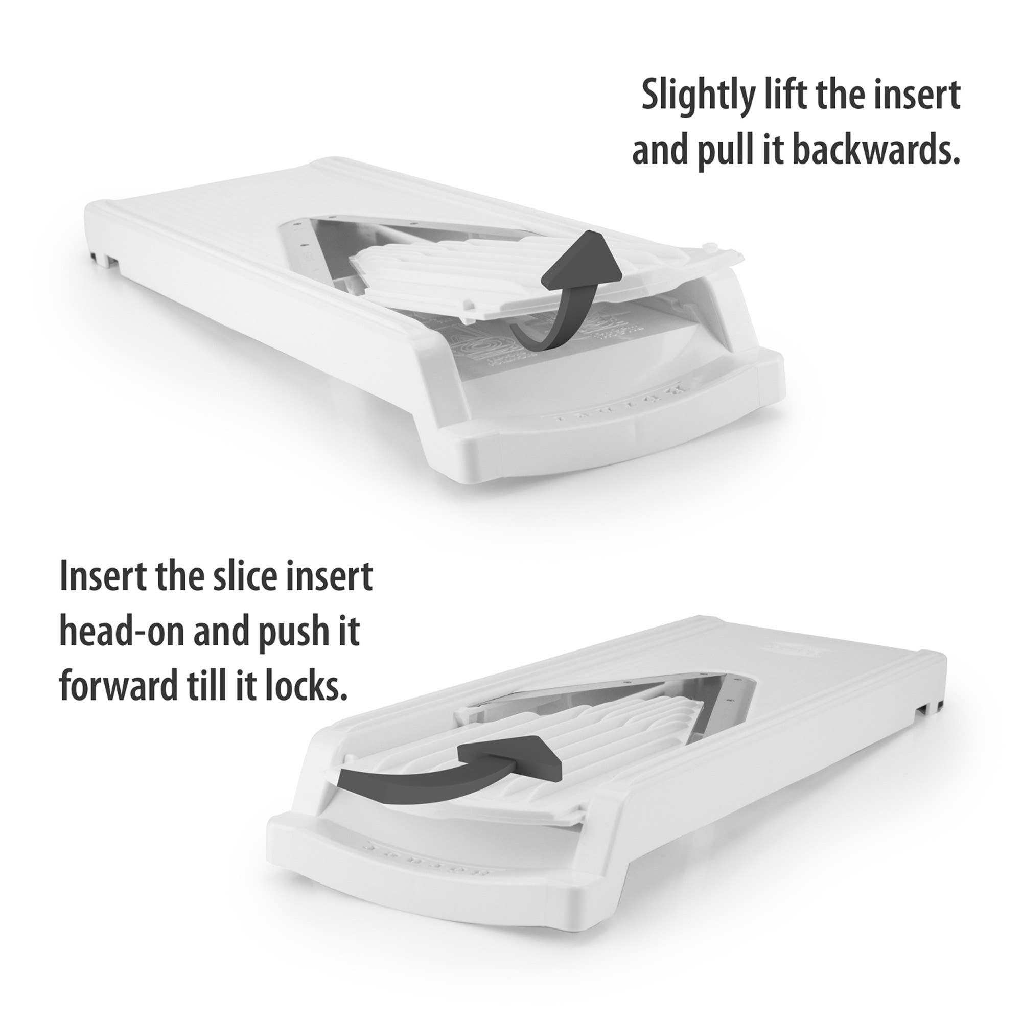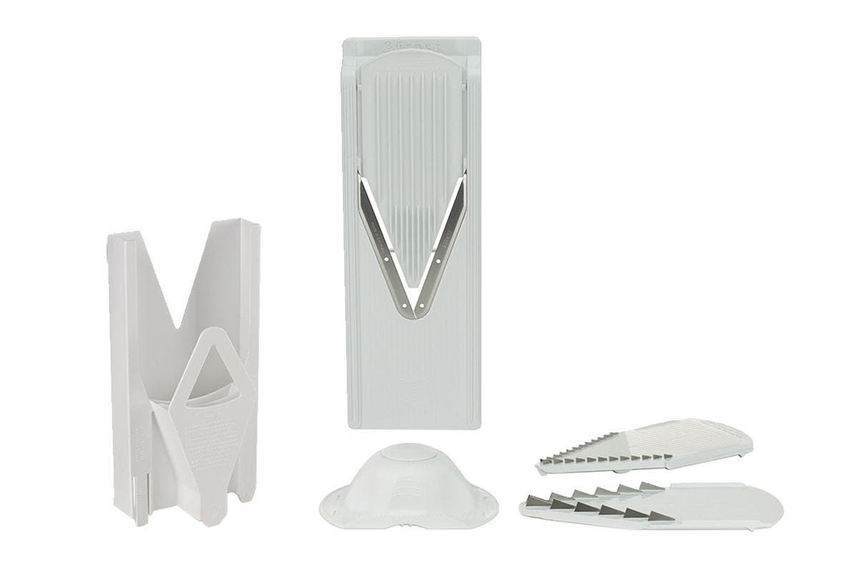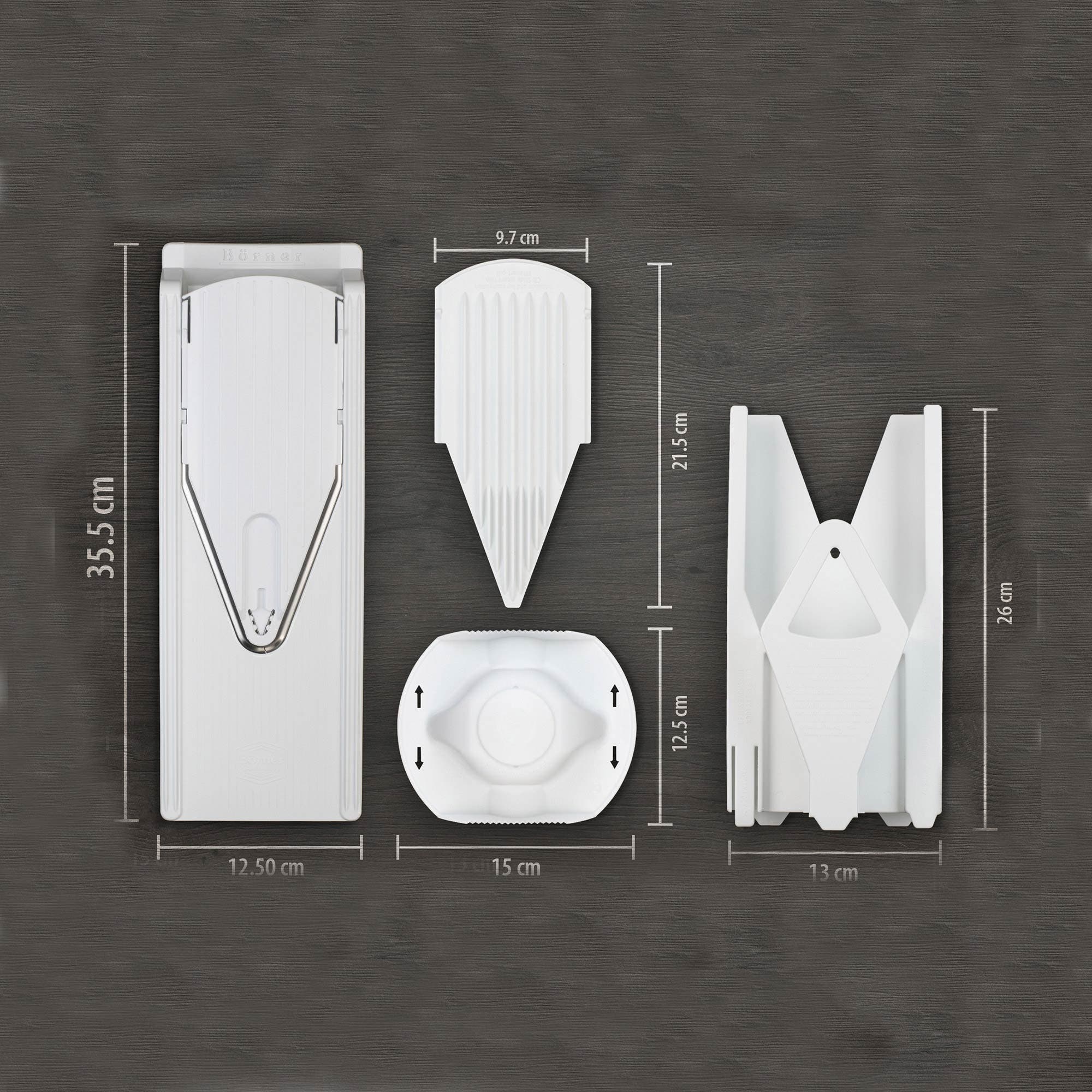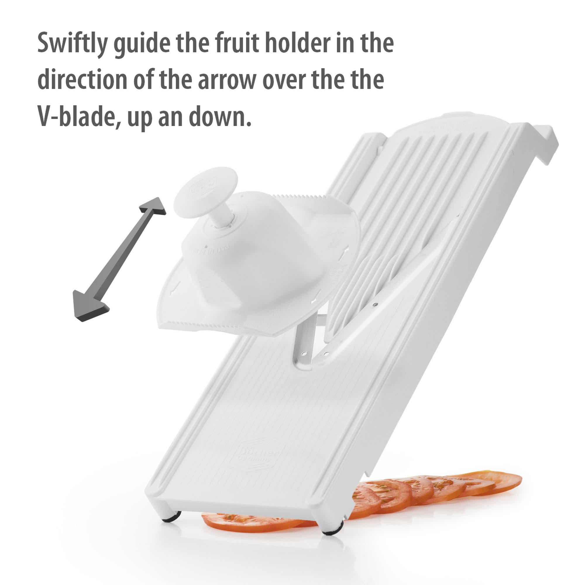 The Borner V3 Trendline Starter Set quickly and easily cuts and slices your fruits and vegetables. This set has 3 different inserts for thin or thick slices, 3.5mm or 7mm cubes or thick strips for French fries.
