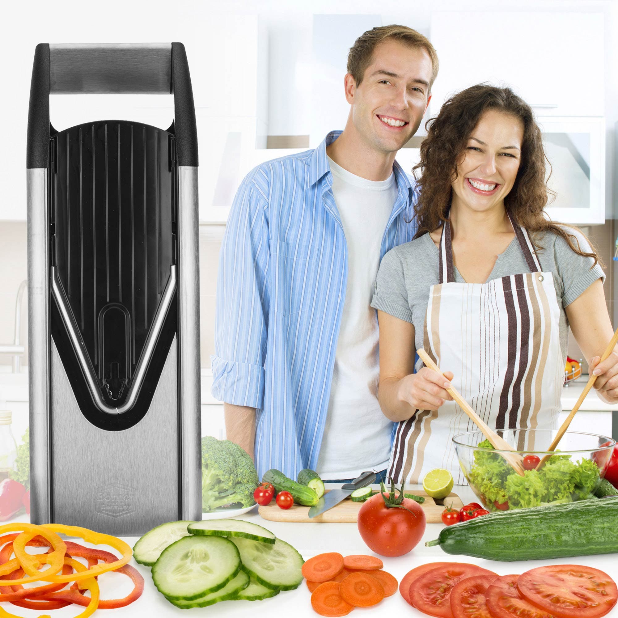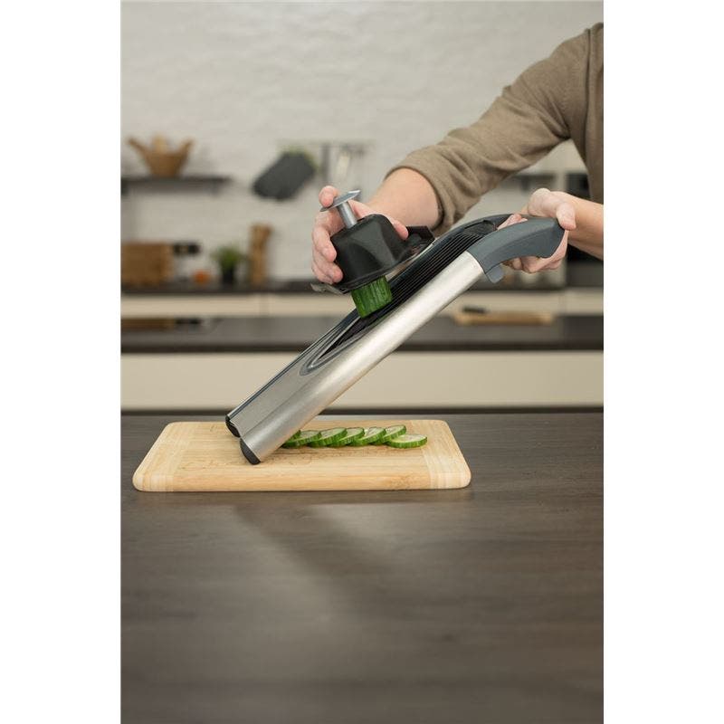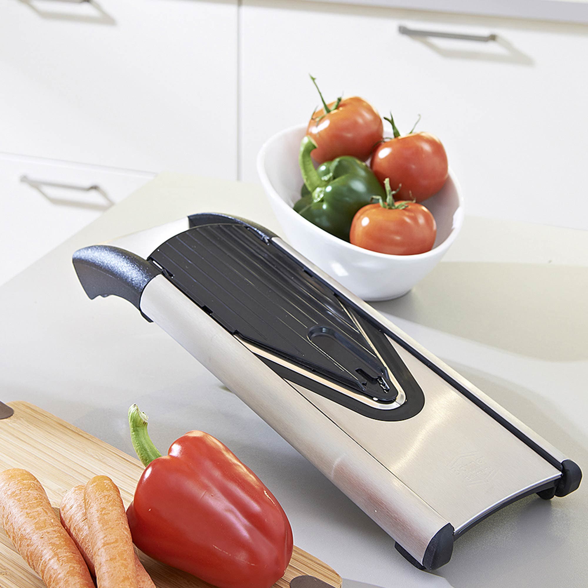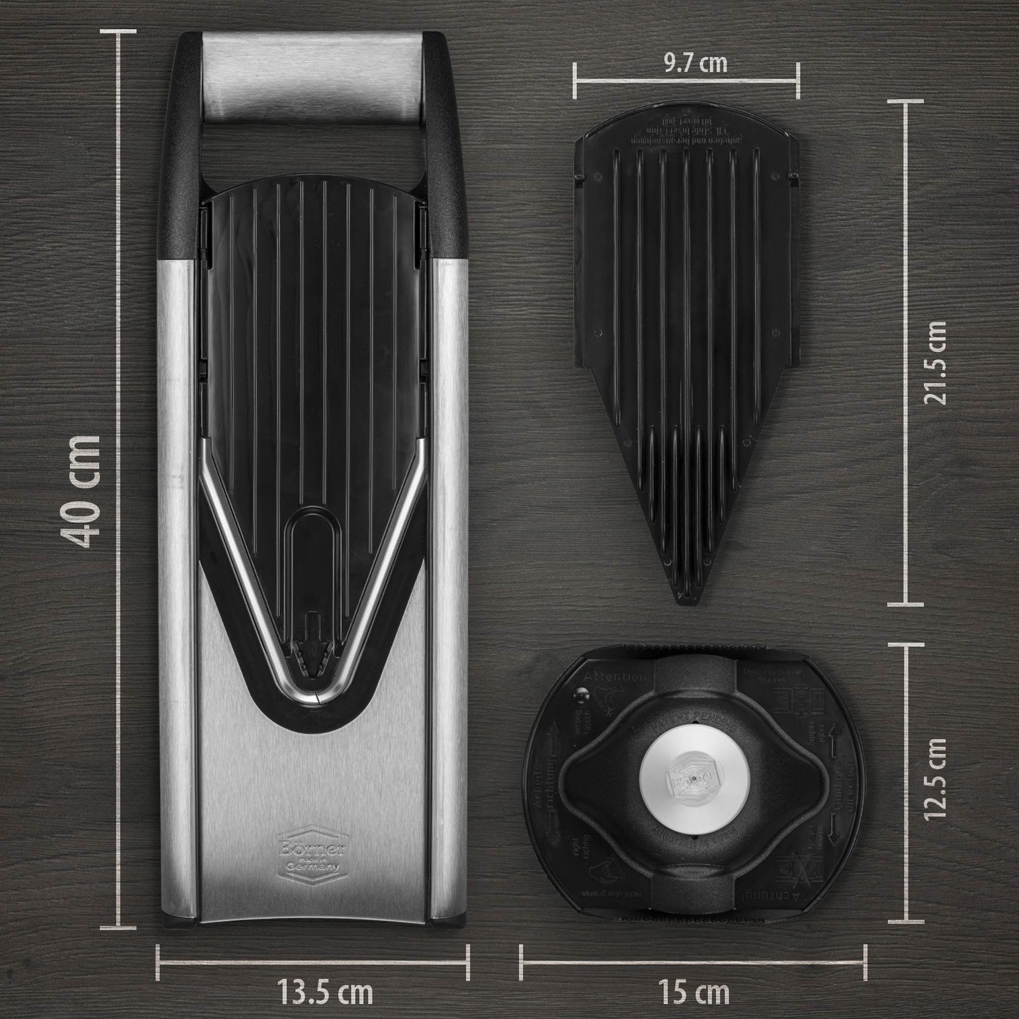 The Borner V6 ExclusiveLine Basic Set cuts the hardest fruit and vegetable into uniform and even slices. Just place fruit or vegetable in the included safety food holder and swap the safety insert with the slicing insert.