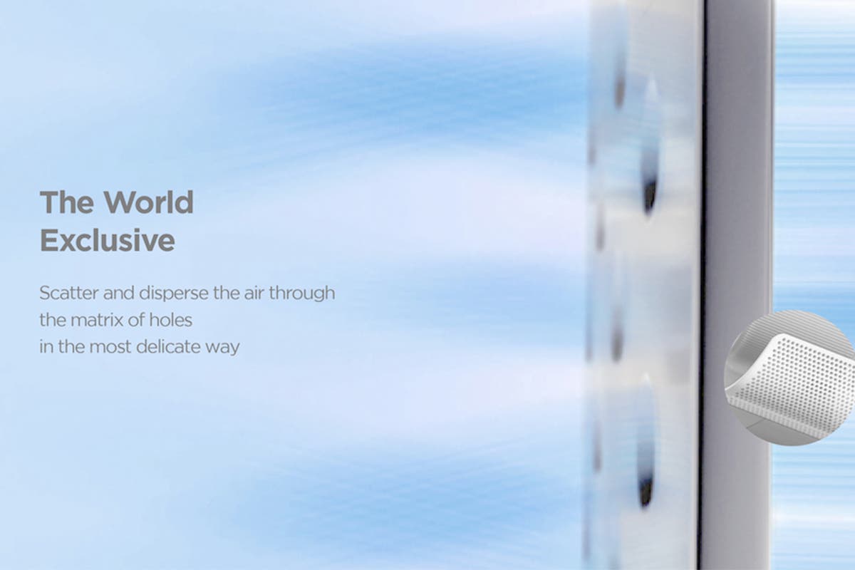 All 7,928 micro-holes on the 2 deflectors are designed to soften the cool air, where the cool air current passes through and transforms into thousands of unnoticeable tiny strings of air that breezelessly drop the room temperature.