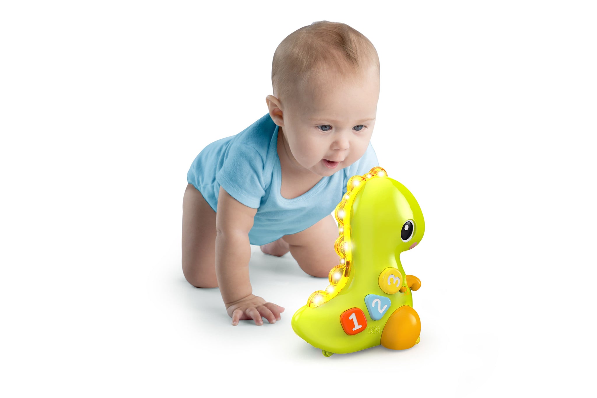 The Bright Starts Go, Go, Dino Crawl & Count Toy rolls around to encourage baby to get moving. This dino toy introduces numbers, colours and shapes with easy to push buttons.