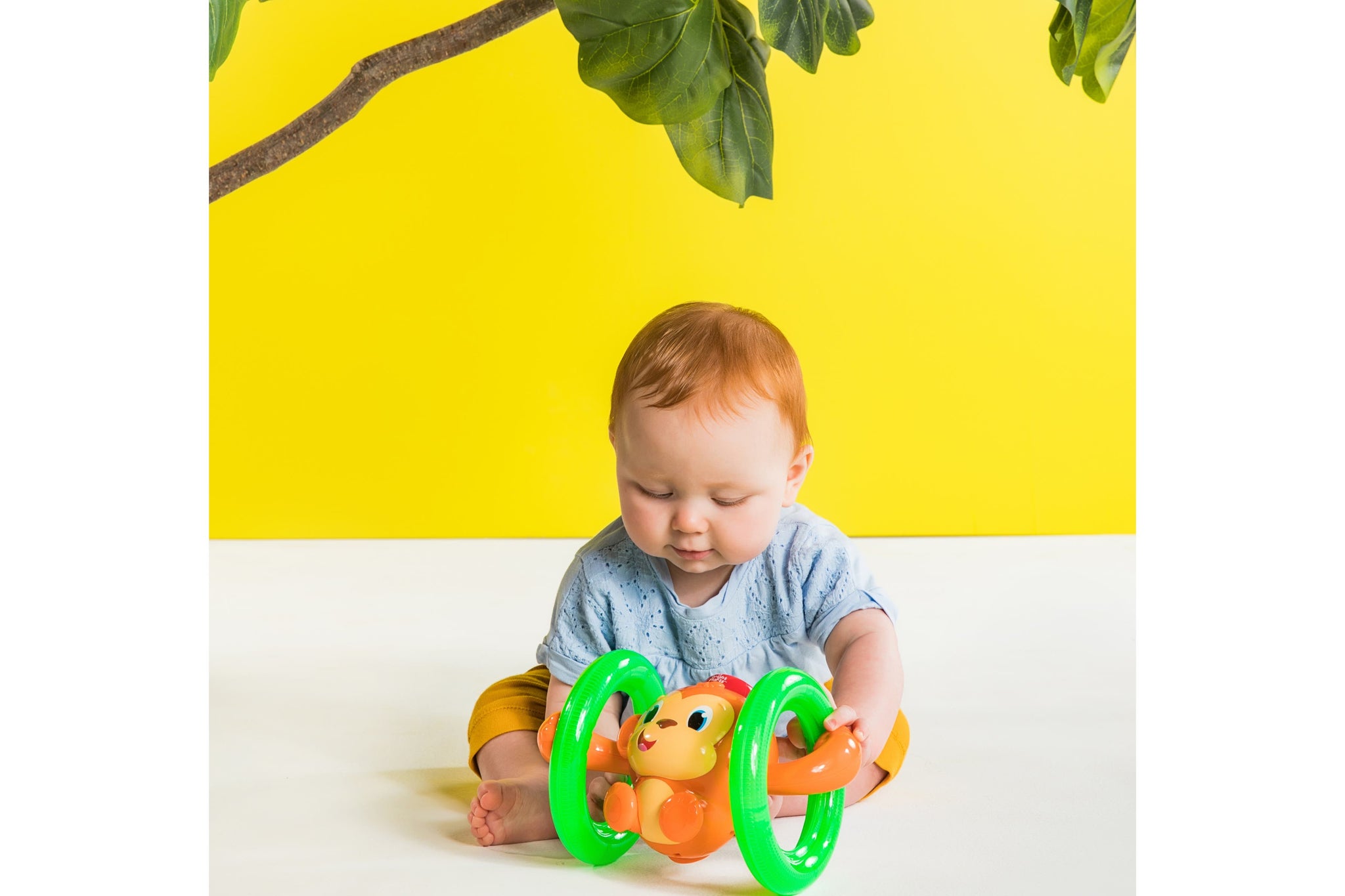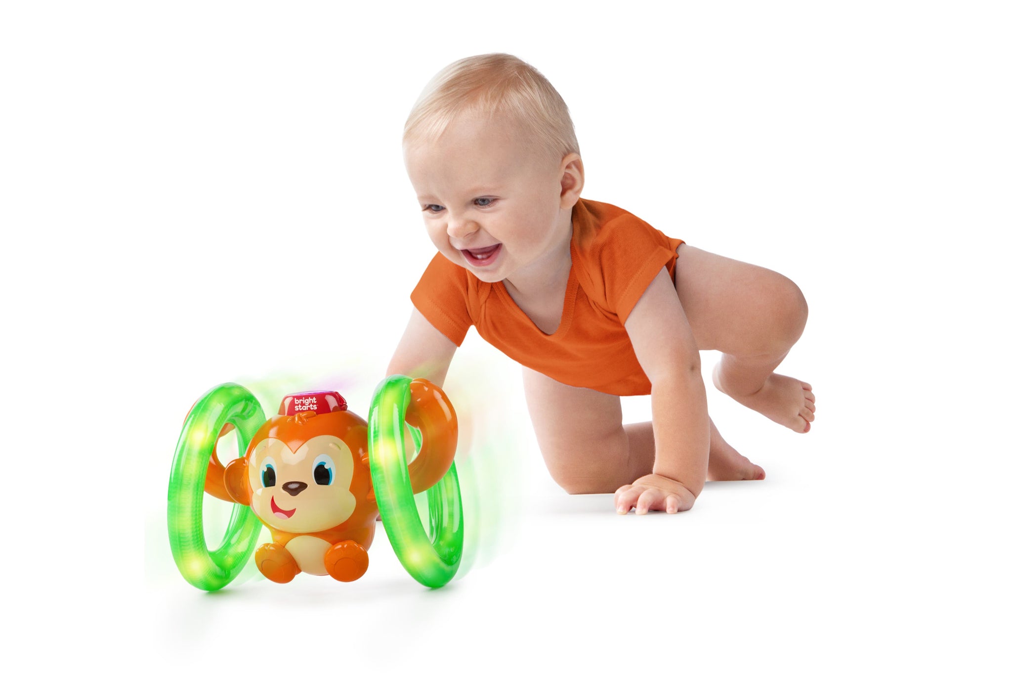 With just a tap on the head, the Bright Starts Roll & Glow Monkey Toy is off – sending you and baby on a wild monkey chase!
