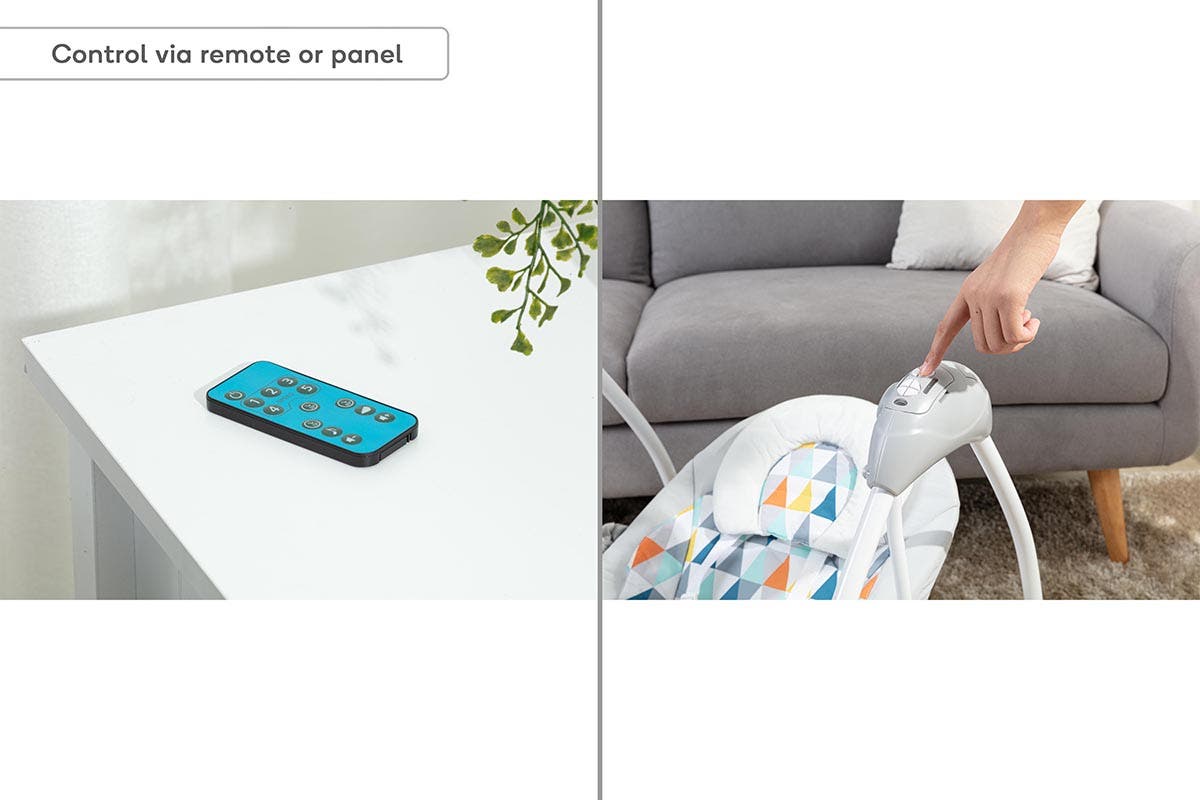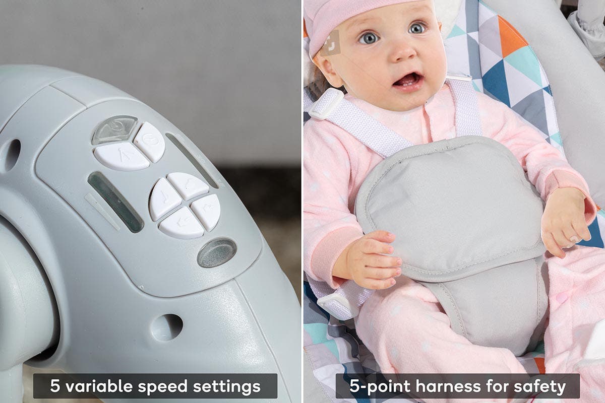 Rest assured that your baby is safe in the swing thanks to the five-point harness that keeps them secure while they sway, and the built-in seat lock that ensures they remain stationary. Plus, you can enjoy smooth control with the remote or control panel that lets you adjust the settings as needed for peace of mind.