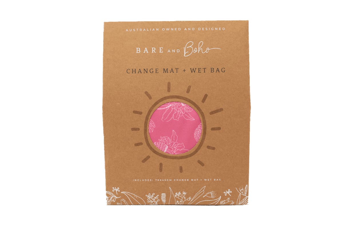 The Bare & Boho Changemat & Medium Wetbag Waratah is luxuriously soft and durable quilted portable changing mat that provides a comfortable place to change your baby’s cloth nappy.