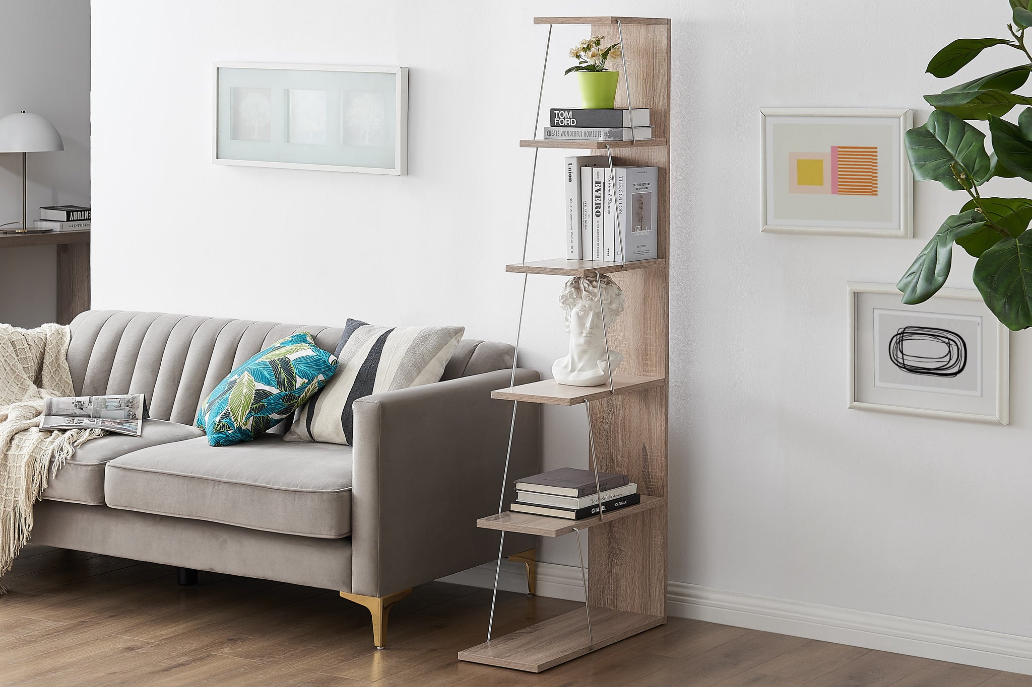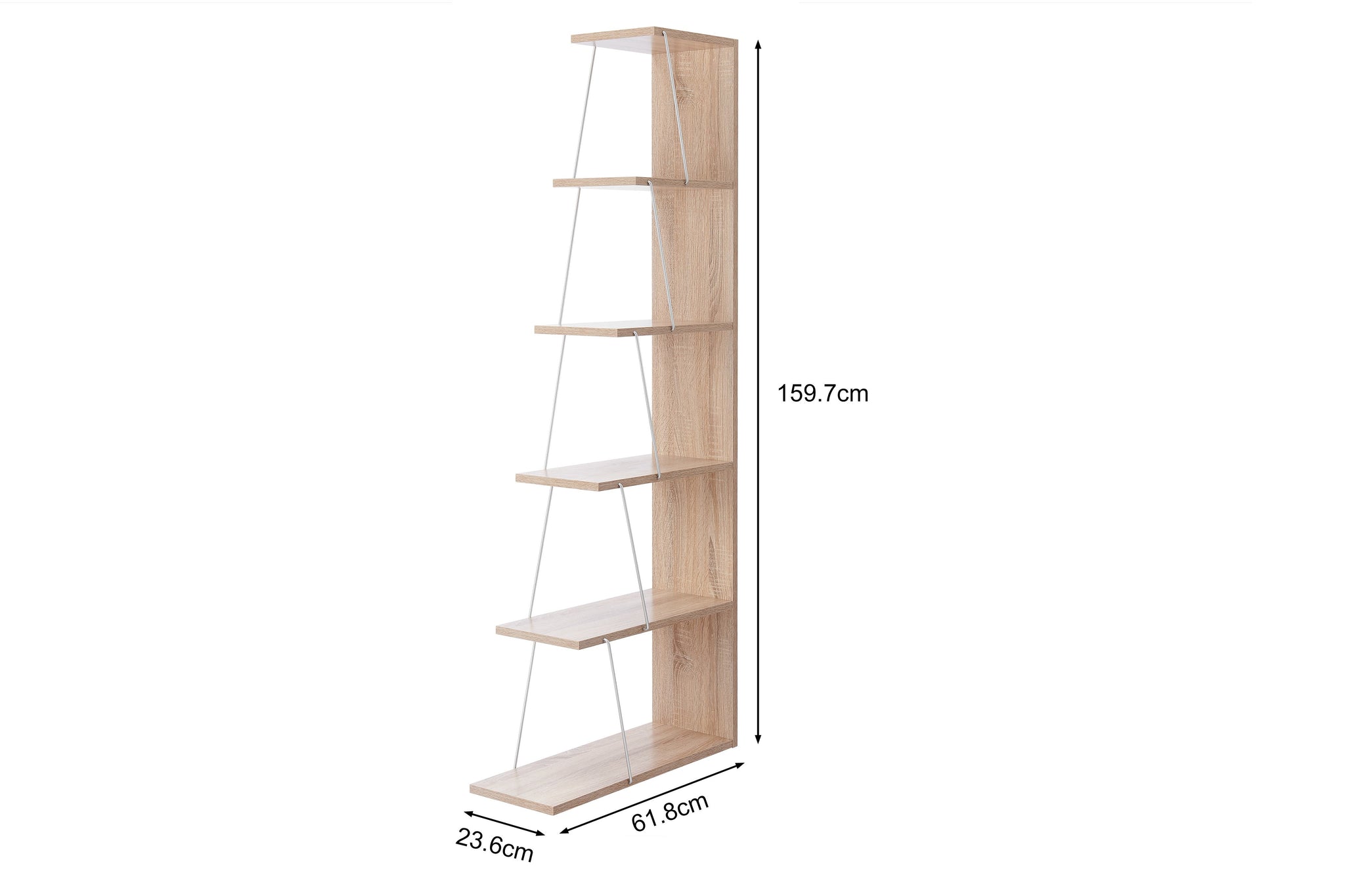 Create an eye-catching display for your books, photos and decorations thanks to this five-tiered staggered bookshelf with a design that’s perfect for the living room, hallway or bedroom.