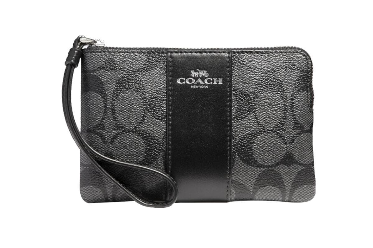 The Coach Corner Zip Wristlet In Signature Canvas features a wrist strap for versatile carrying. It can fit an iPhone or Android phone.