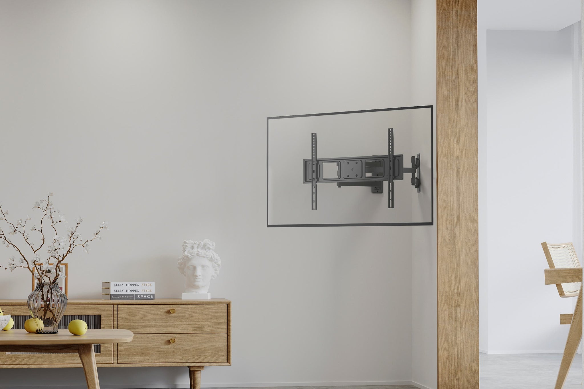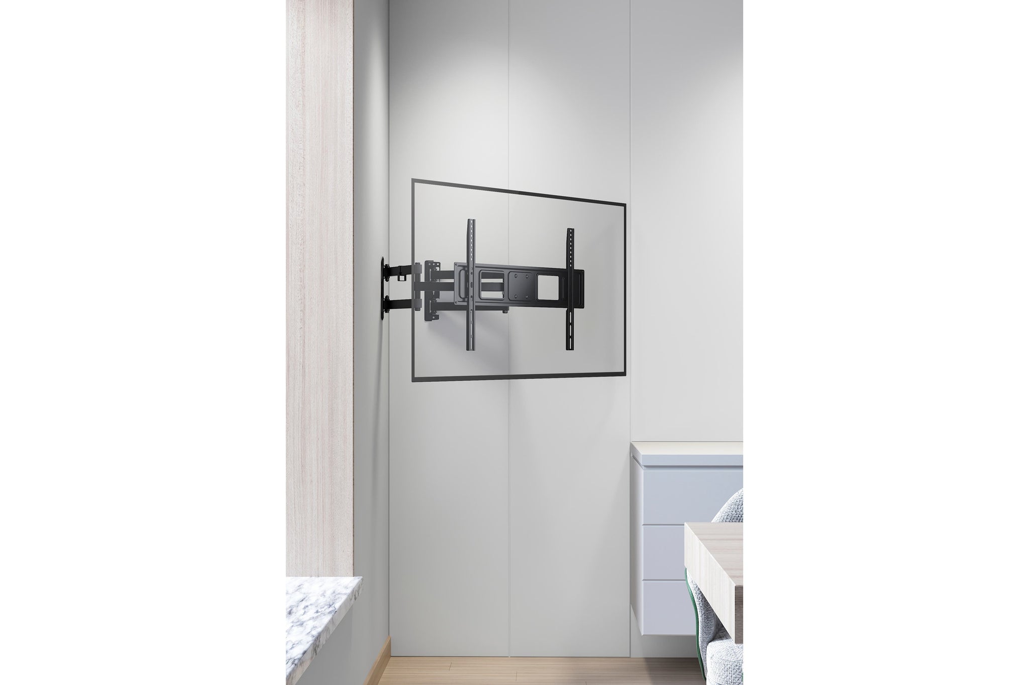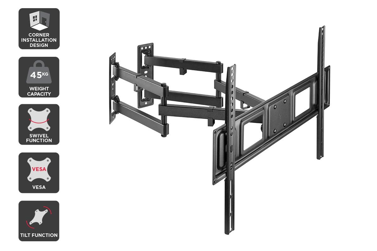Featuring a split wall plate that can be fit to a wide range of corners or flat walls, a swivel design that can adjust both left and right, free horizontal tilting and a built-in level adjustment, this wall mount can be perfectly tailored to your TV.