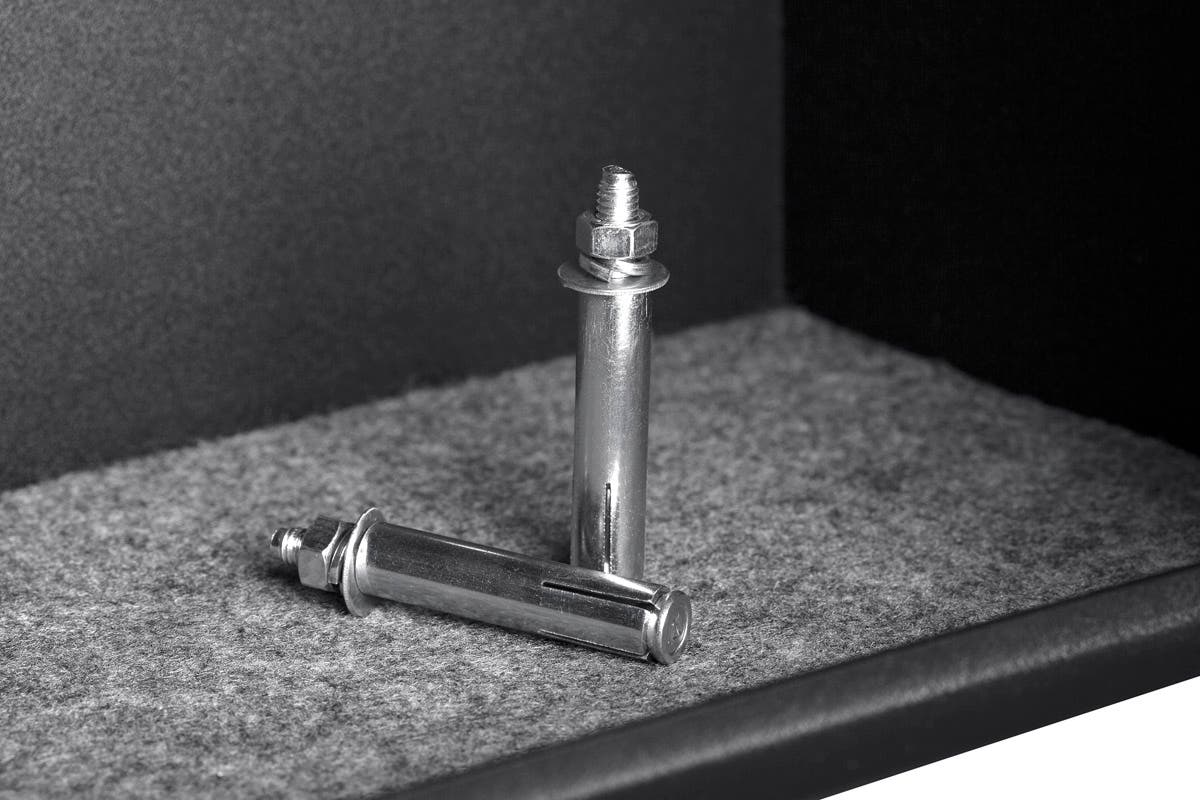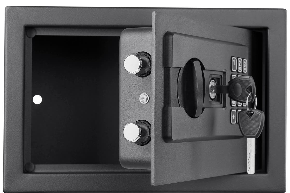 With its solid steel construction and heavy-duty chrome steel dual pin bolt throw system, this safe lock box ensures no prying hands will get to your belongings. Additionally, it features pre-drilled holes in the base and on the back so that it can be secured to a wall or to the floor with the included fixings.