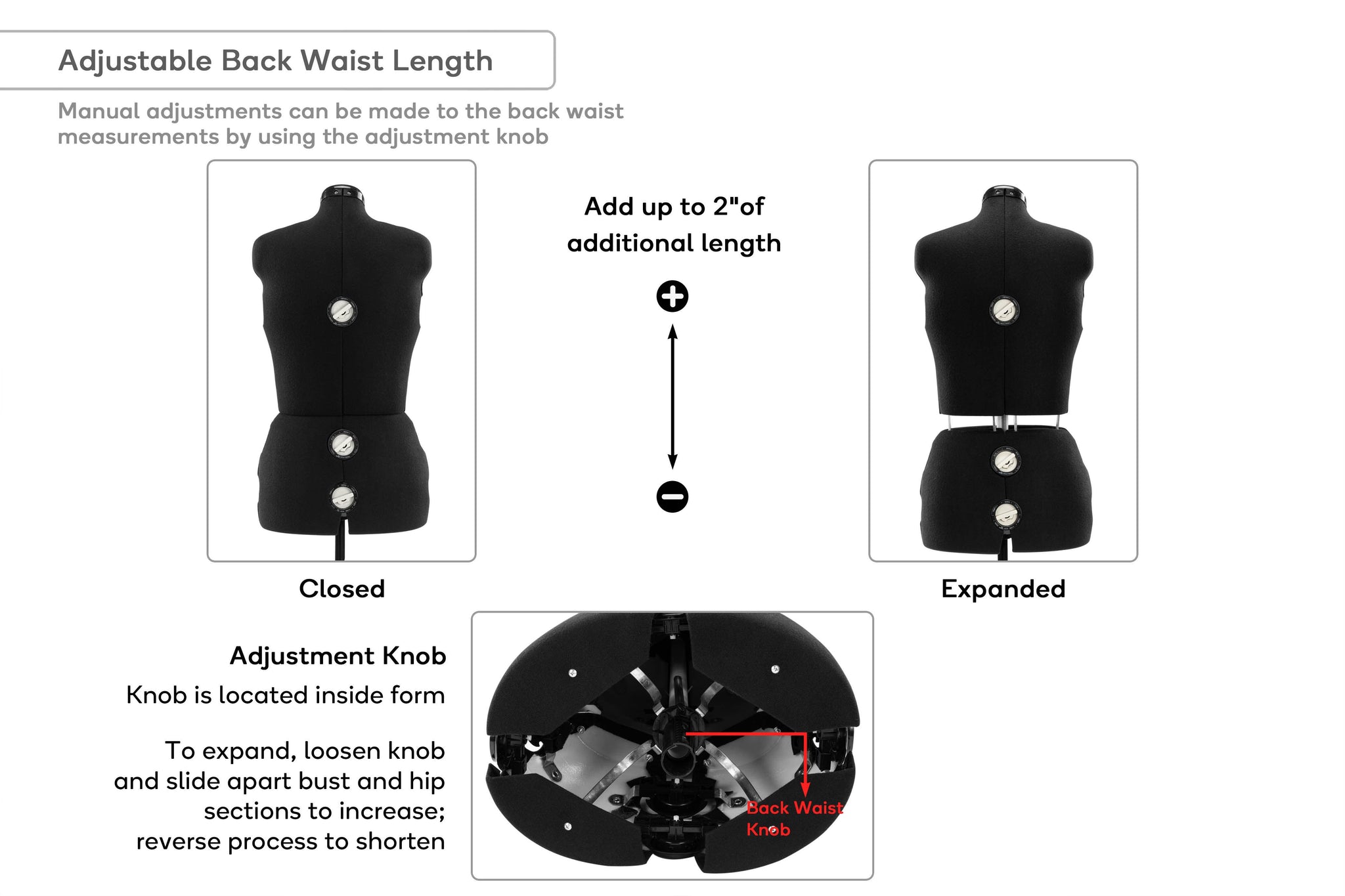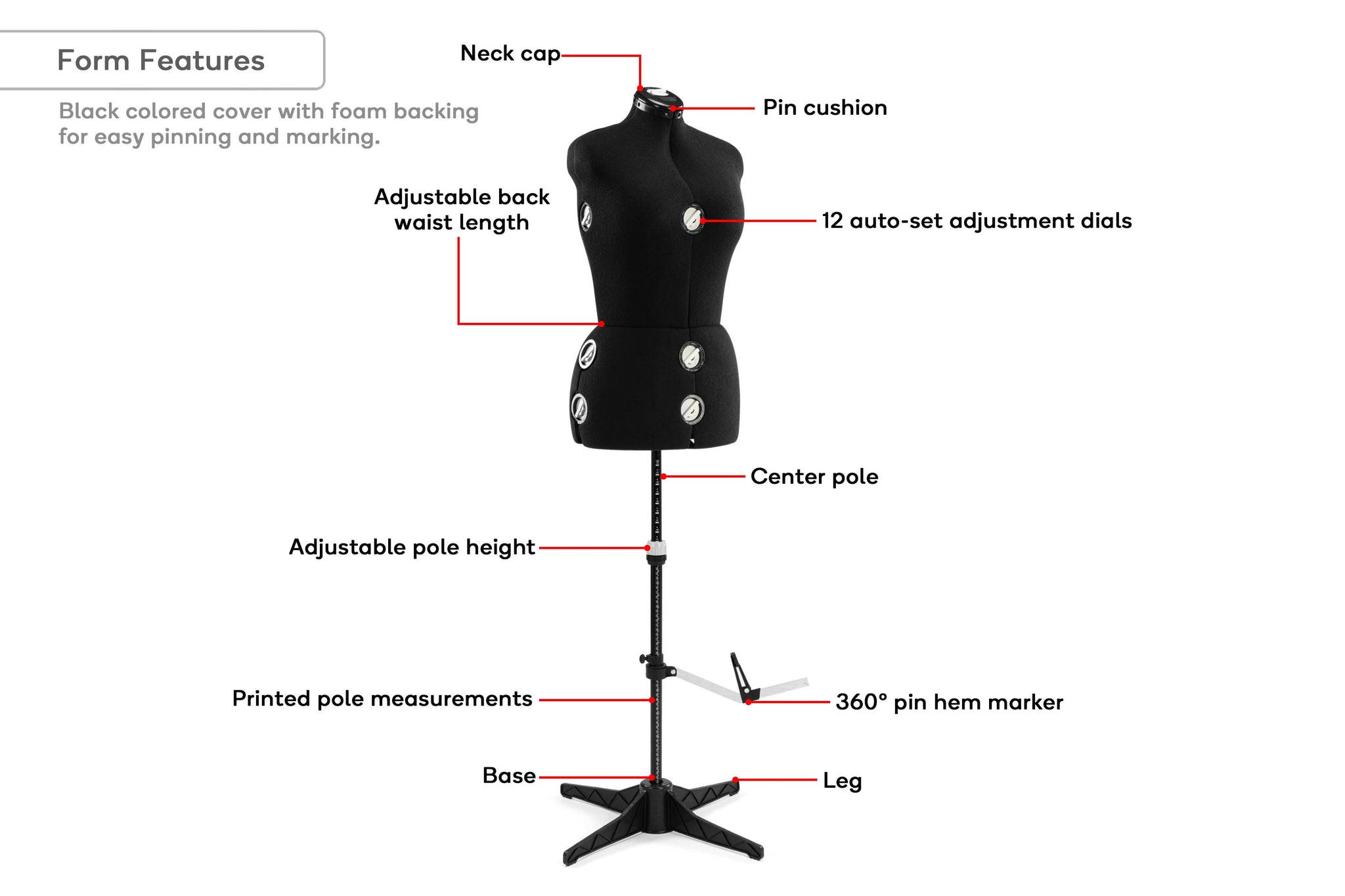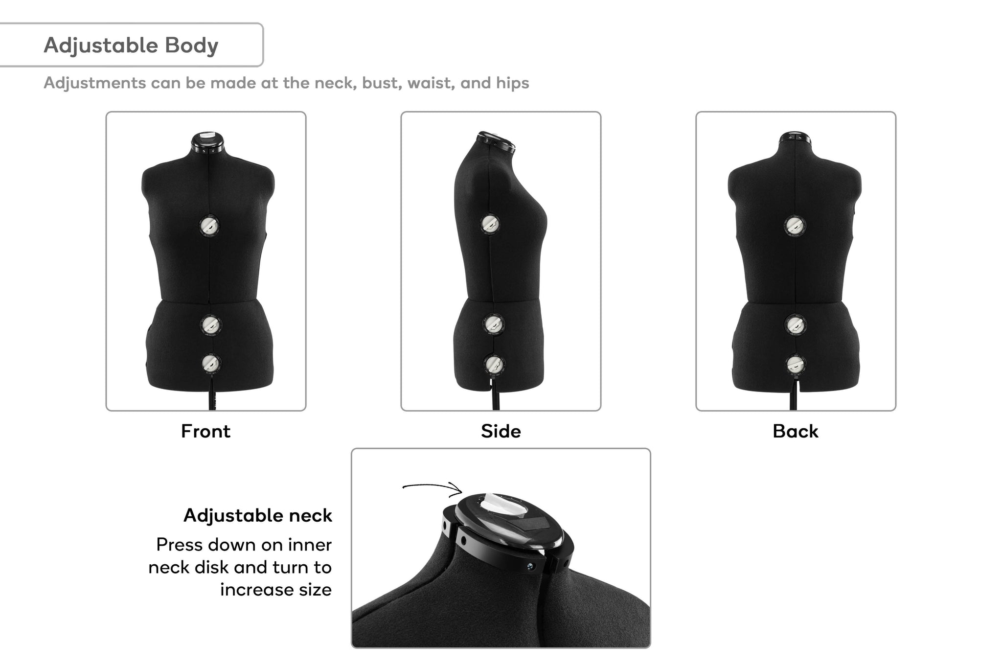With adjustable neck, torso, and multiple body dials, you can adjust this dress form to suit your preferred dress size, perfect for fitting and draping.