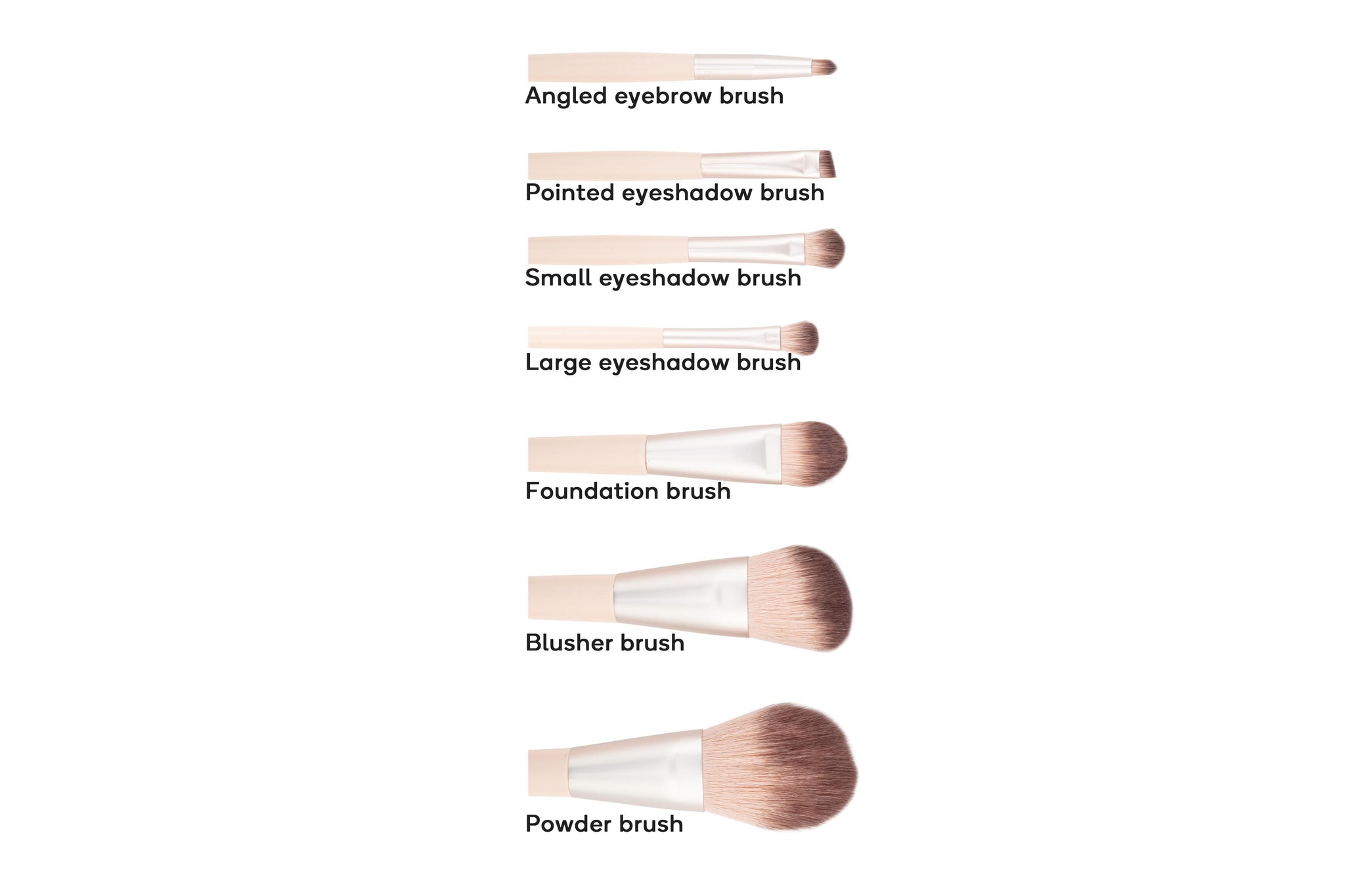 - Brushes included: 1 x powder brush, 1 x flat head kabuki, 1 x tapered blusher brush, 1 x foundation brush, 1 x eyeshadow detail brush, 1 x tapered eyebrow brush, 1 x round blending brush