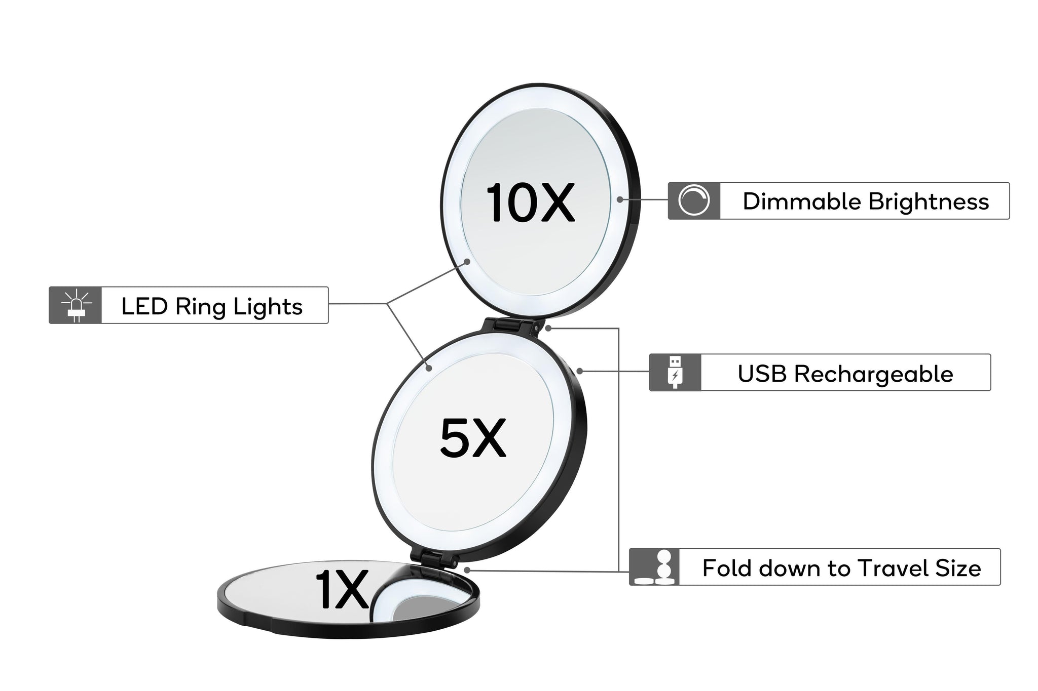 - Unfolds into 3 round mirrored panels