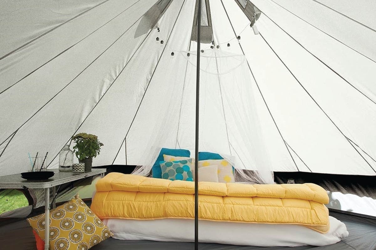 This eight-person glamping tent features a massive internal room that comfortably fits the whole family and doubles up as a recreation room during the day if the weather turns bad.