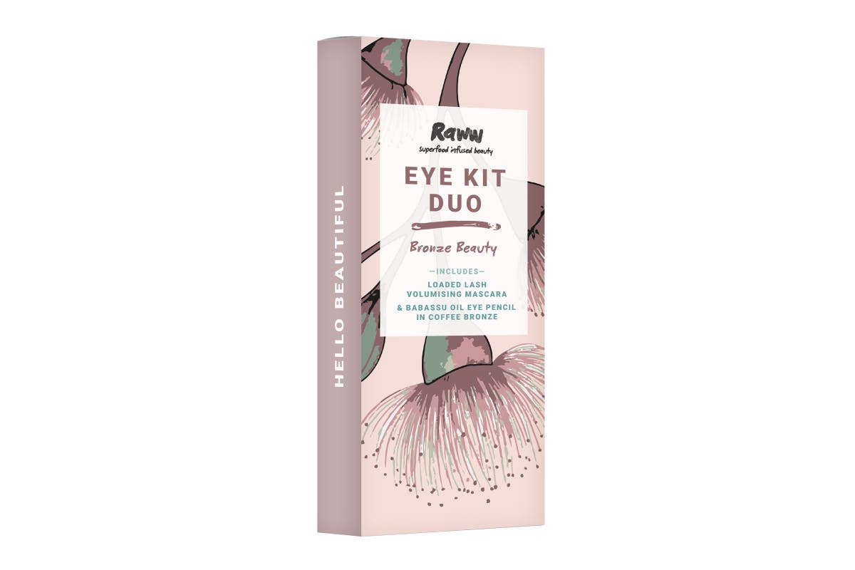 The RAWW Eye Kit Duo features full-sized loaded lash mascara in black and a certified organic babassu oil eye pencil in metallic coffee bronze. This superfood infused eyeliner and mascara duo adds spark to your eyes.