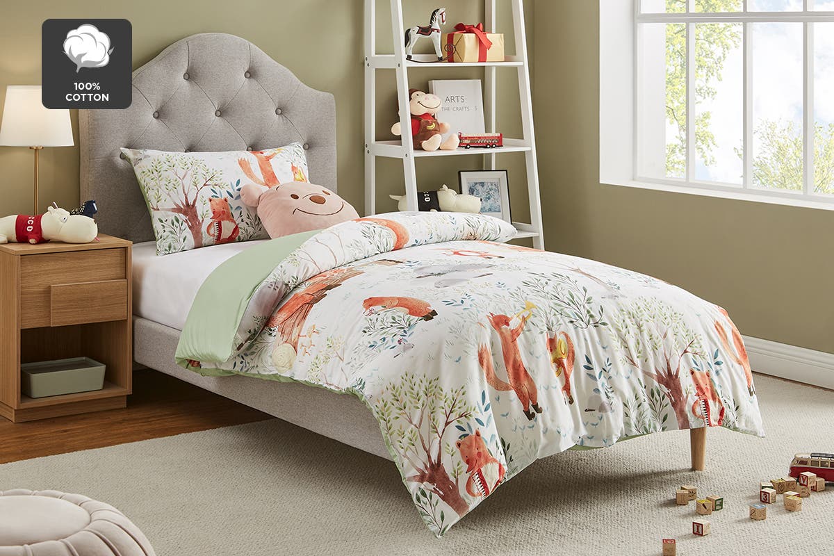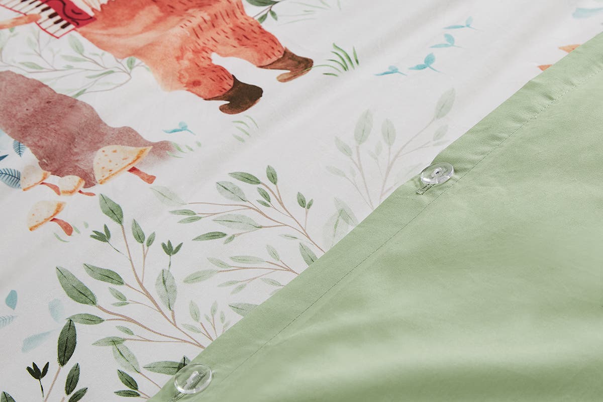 Journey into a dream with friends from the forest by slipping under this kids quilt cover set that features a cheerful animal and forest print that will let your child have loads of fun as they rest under the trees.