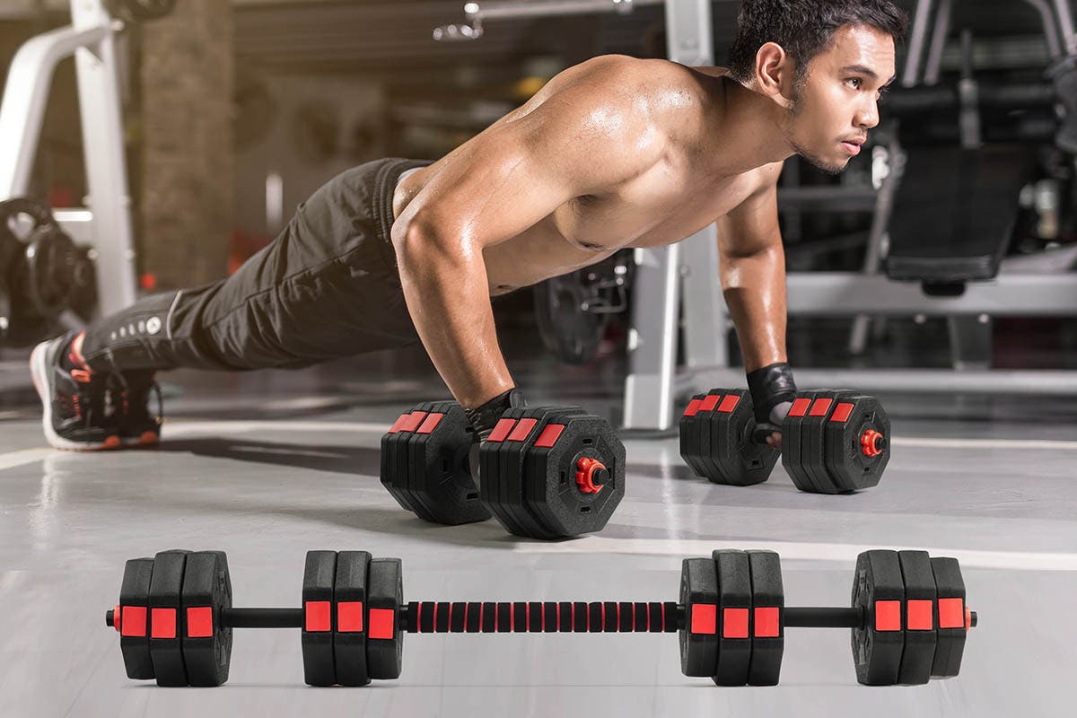 Train your way to ultra-strong with a dumbbell and barbell set that adjusts easily to suit your workout, letting you add more weights as your muscle mass increases.