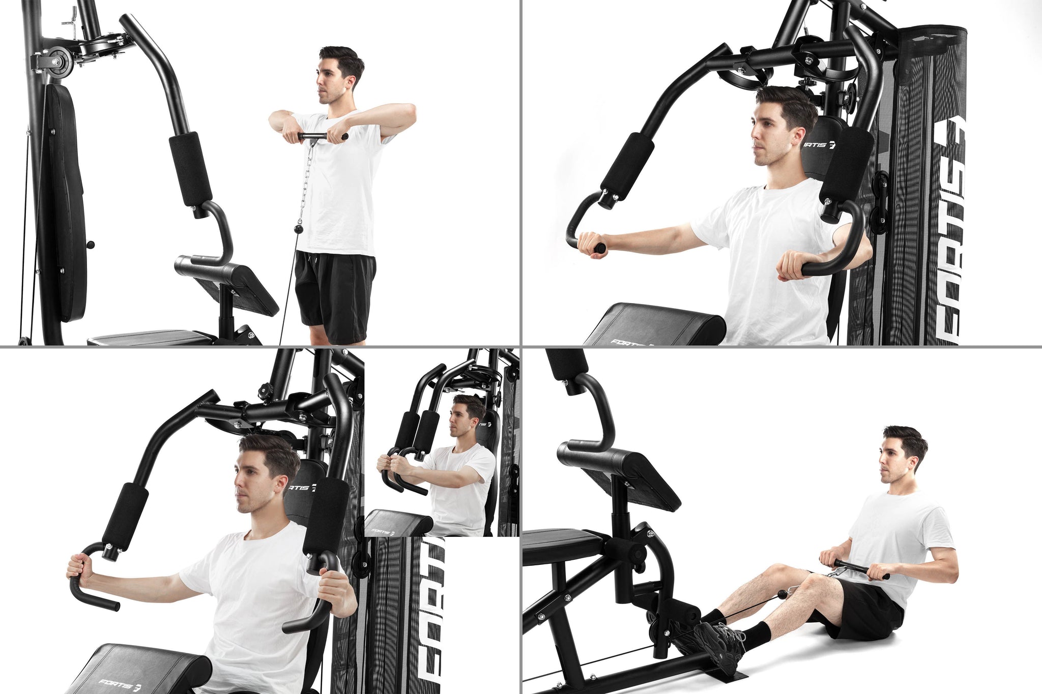 Get shredded and push your limits with multiple training exercises like upright cable rows, machine and butterfly bench presses, leg extensions, and cable preacher curls with the triple pulley system that are built into this all-in-one gym station.