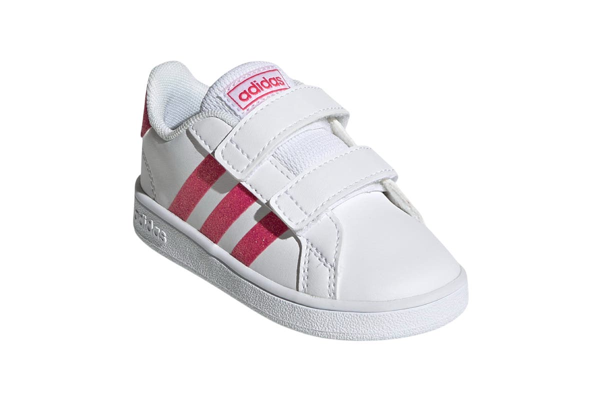 They’ll show their Adidas spirit with retro style. Adidas Girls Grand Court Shoes feature glitter 3-Stripes and a cushioned sockliner that gives small feet ultra-soft comfort. An adjustable strap closure keeps them feeling snug and locked in.