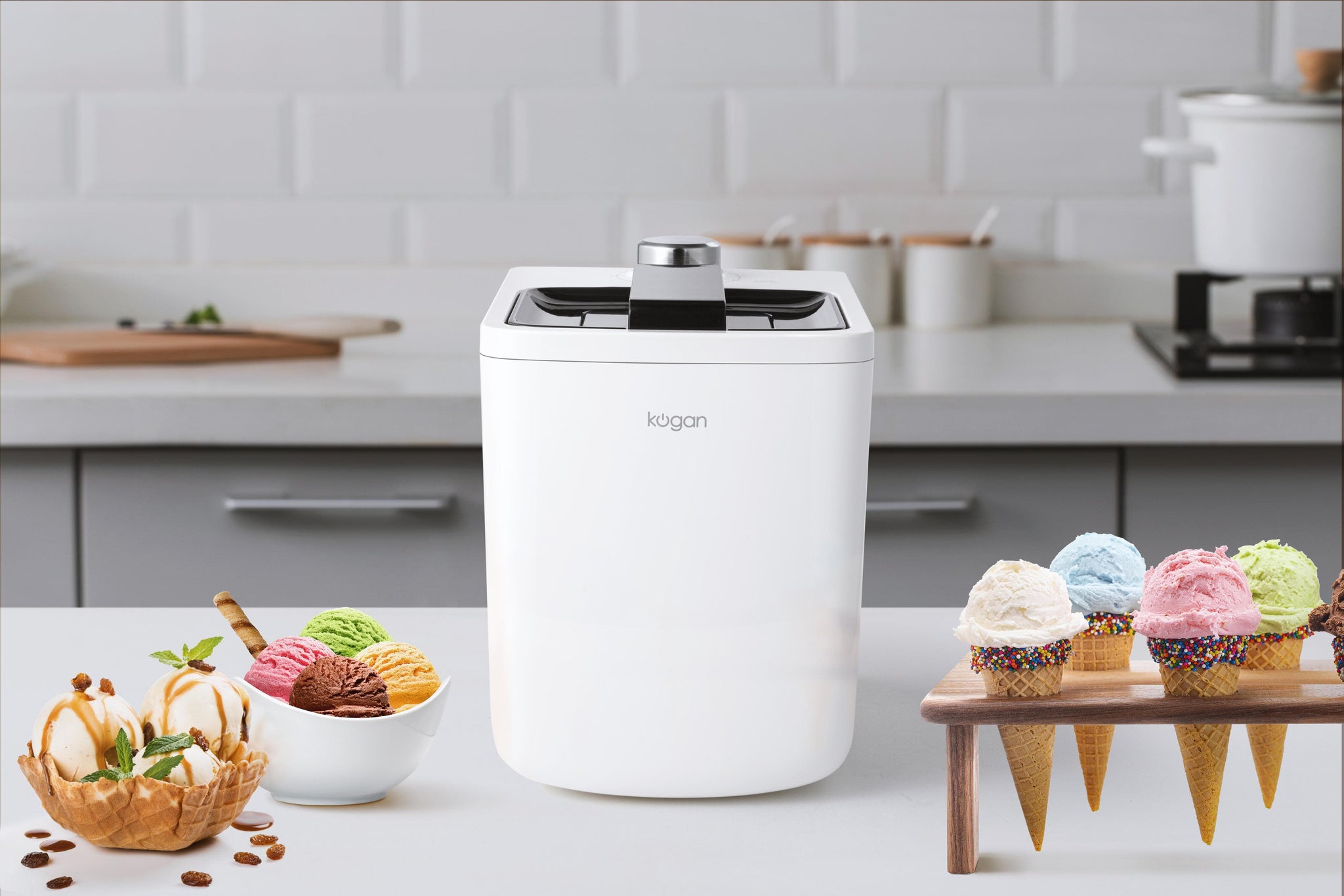 Whip up delicious homemade desserts from scratch using the Kogan Ice Cream Maker which boasts quick operation so that you can scoop, serve and enjoy ice cream, sorbet and frozen yoghurt minutes after churning.