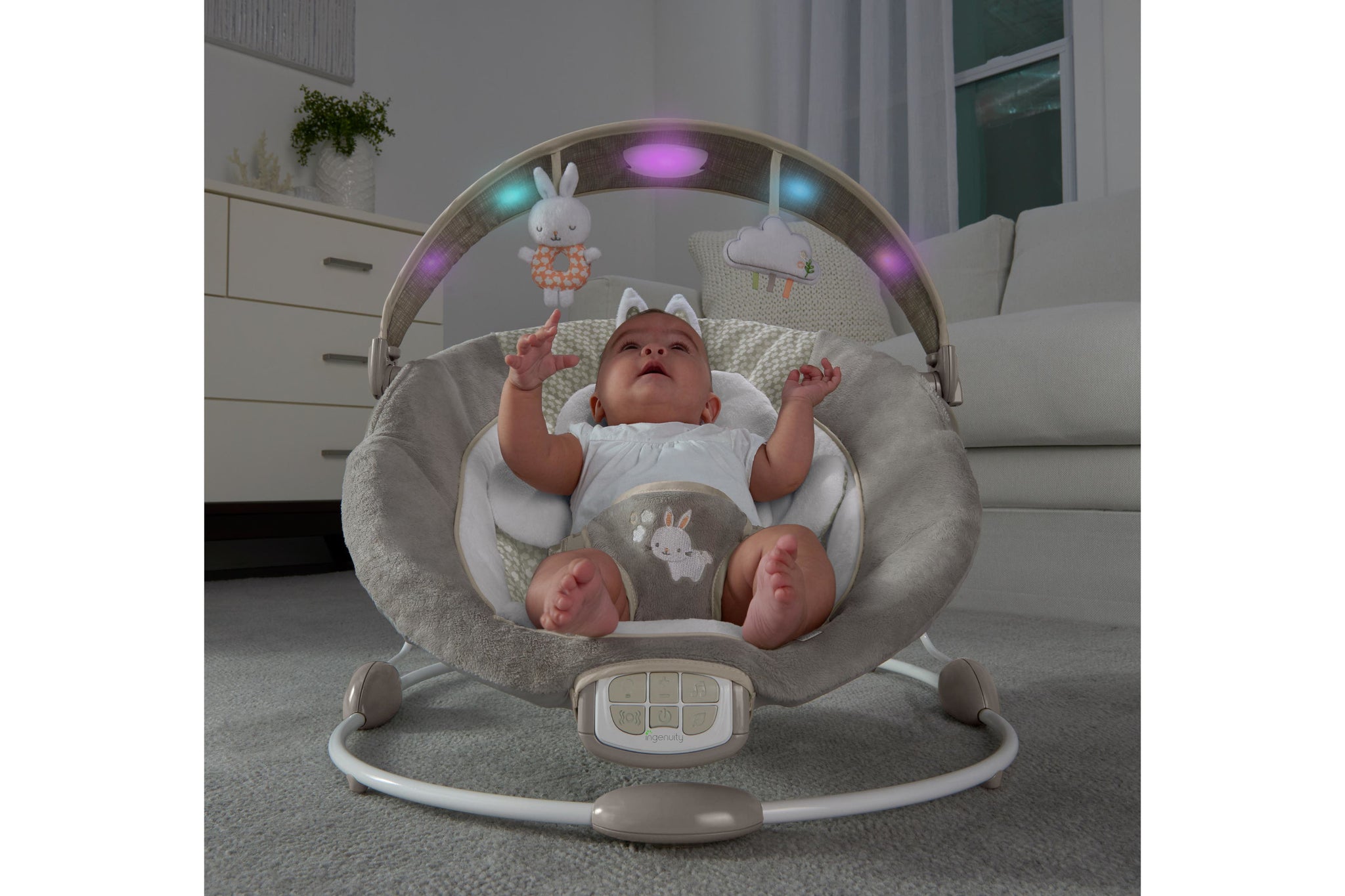 The Ingenuity Inlighten Bouncer – Twinkle Tails is the closest second to mom’s arms. This baby bouncer keeps your little one soothed, comforted and safe by your side.